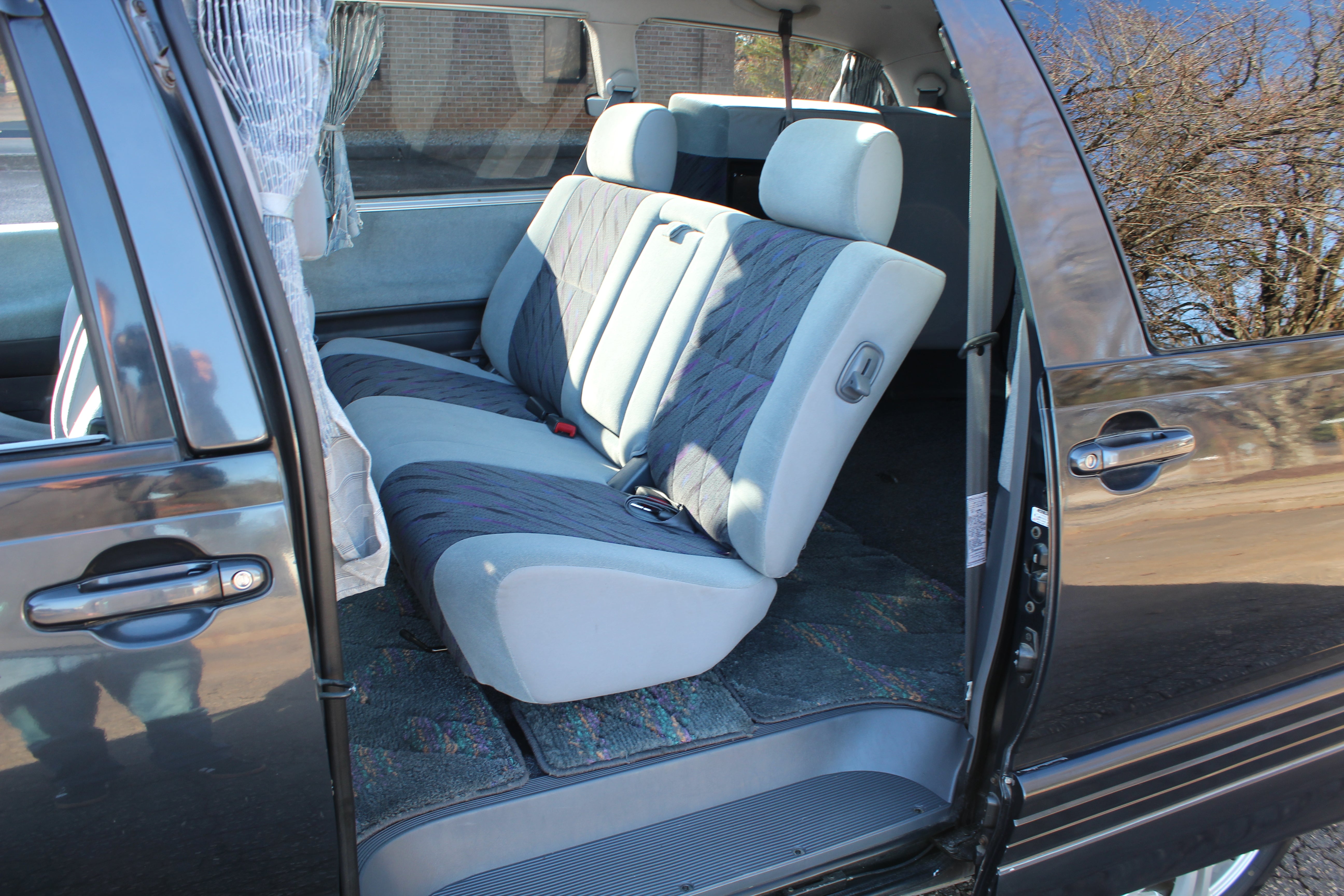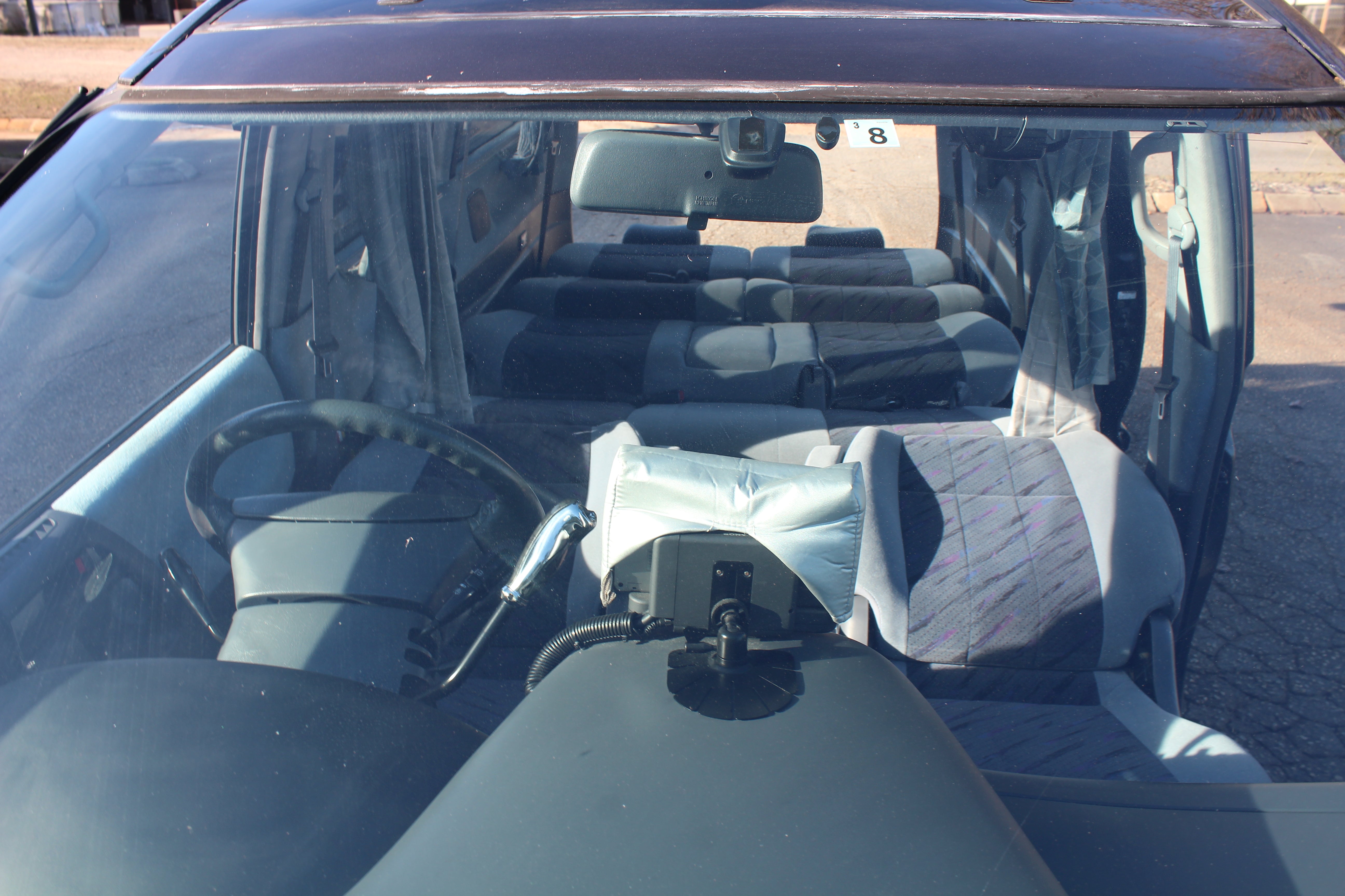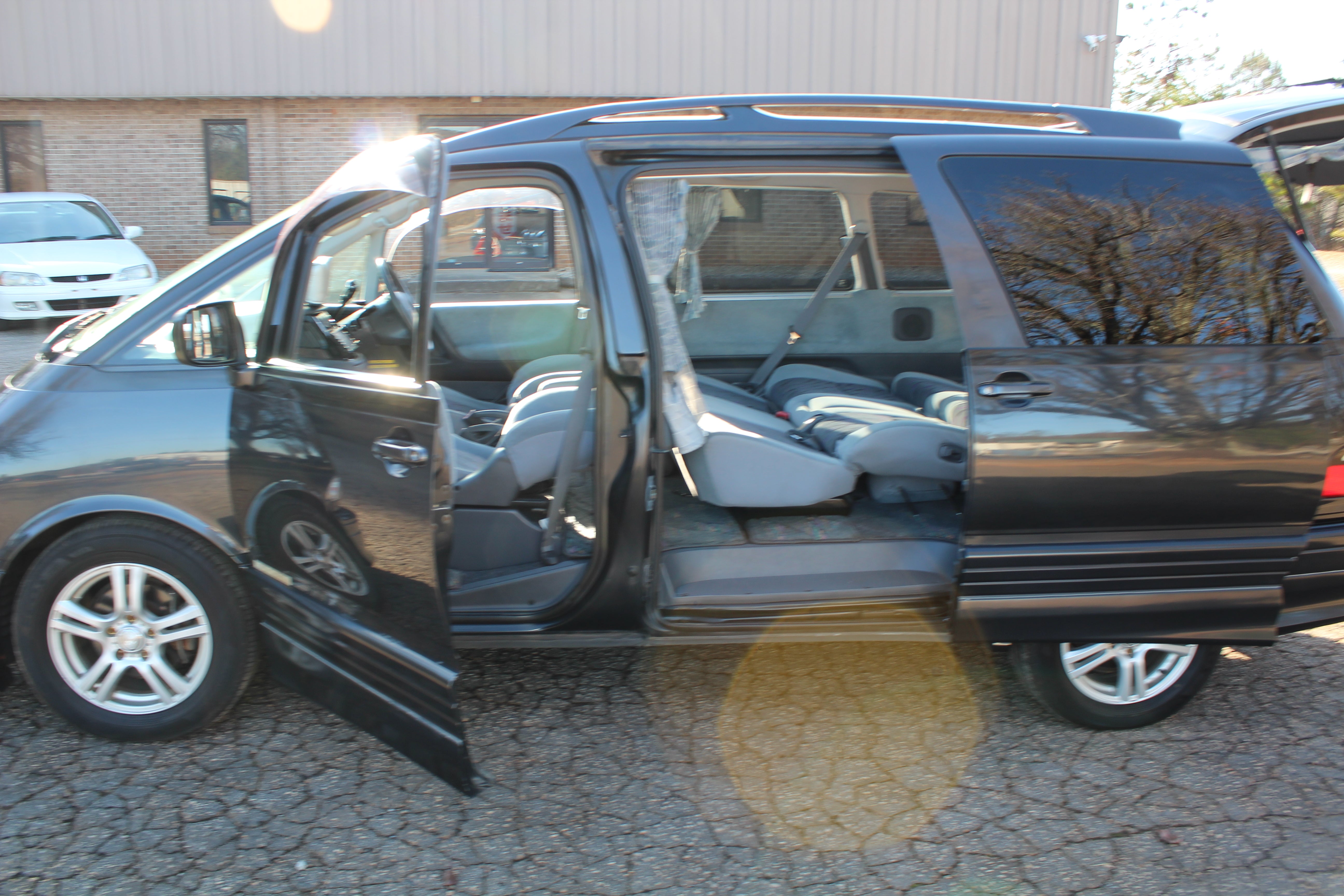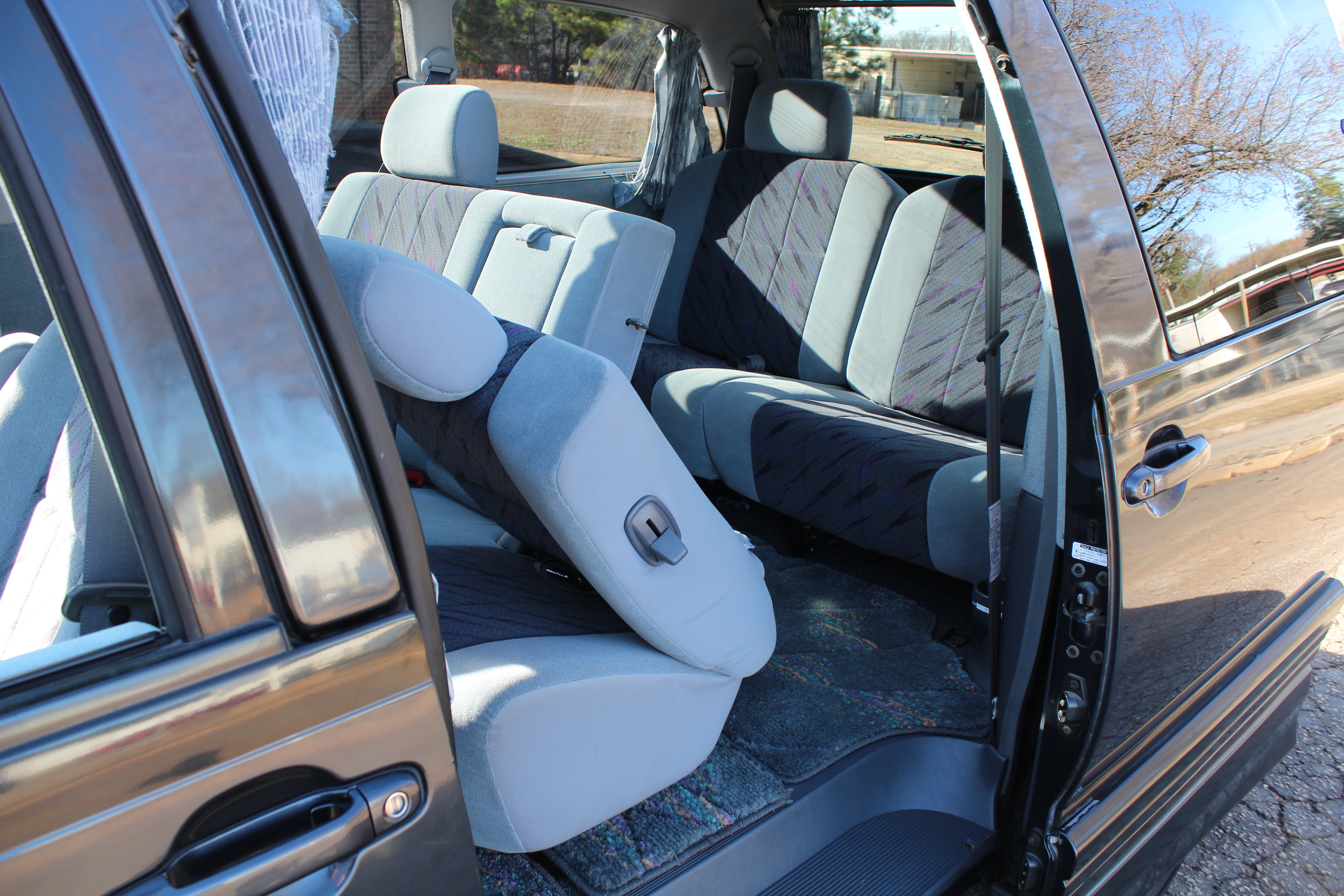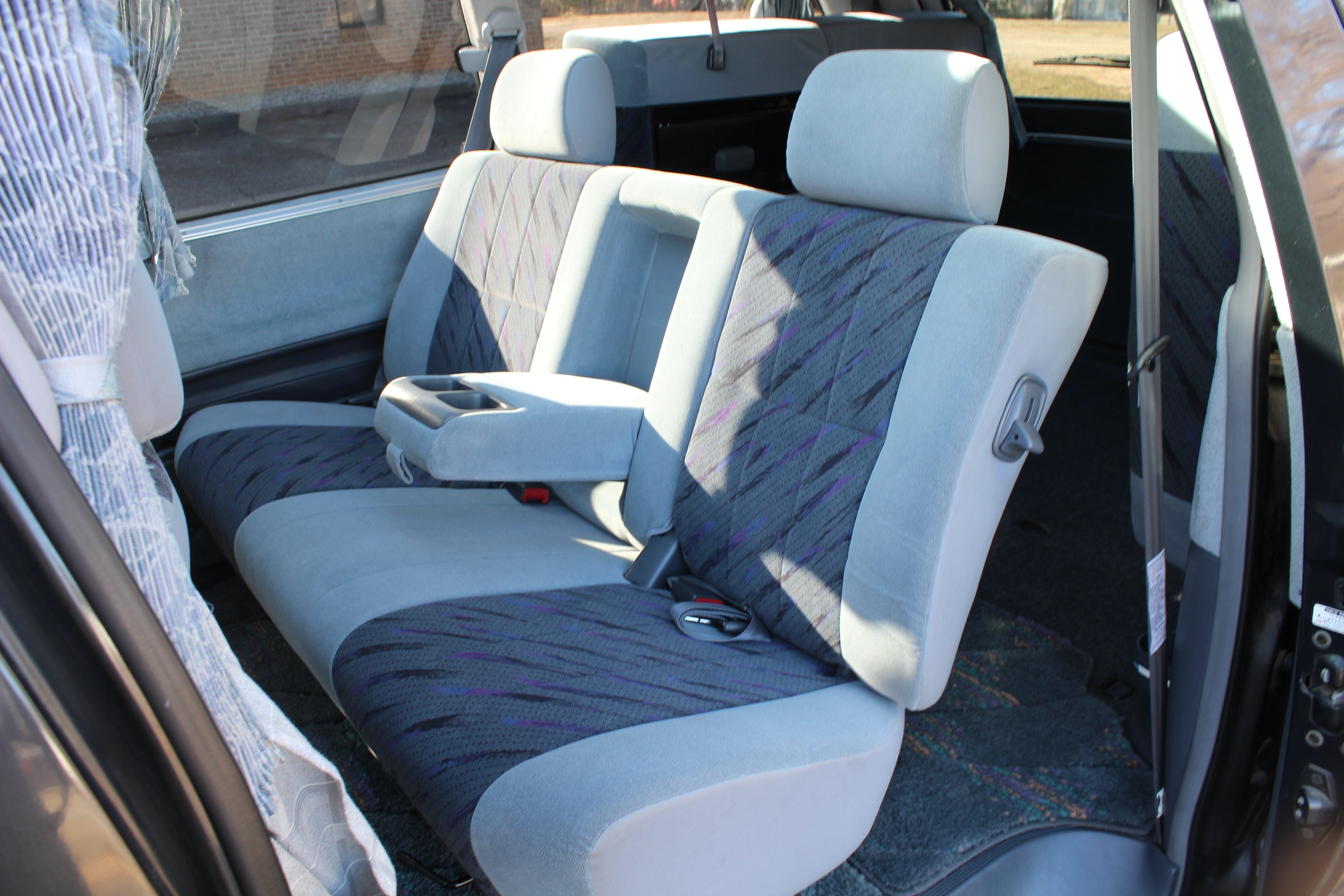 Just has some cosmetic flaws as pictured, dent on rear left quarter, scuffs on front and back bumpers, has paint fade on rear hatch, scratch on rear left sliding door side molding, and someone painted on Japanese writing on it. Interior is good besides for some stains as pictured.