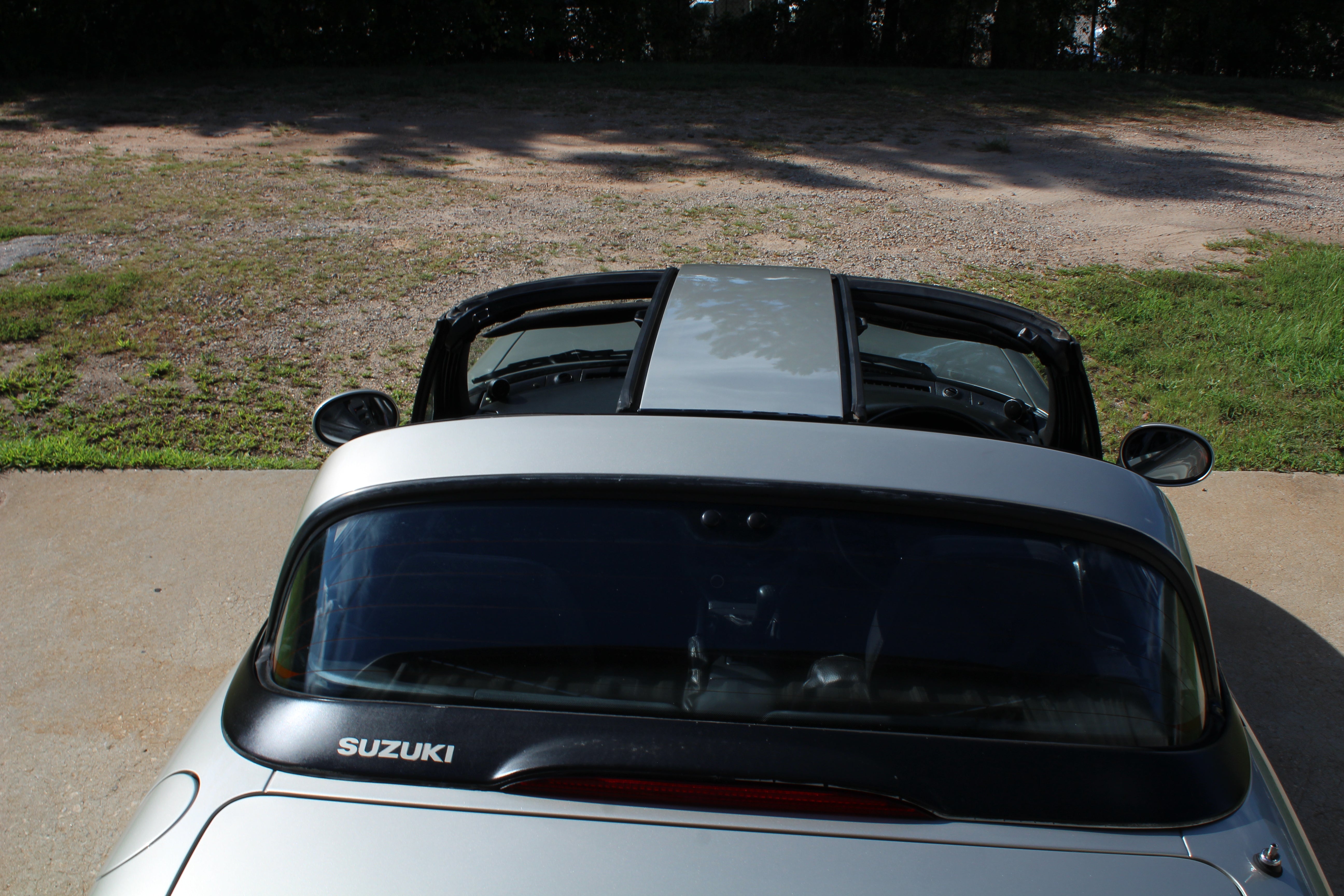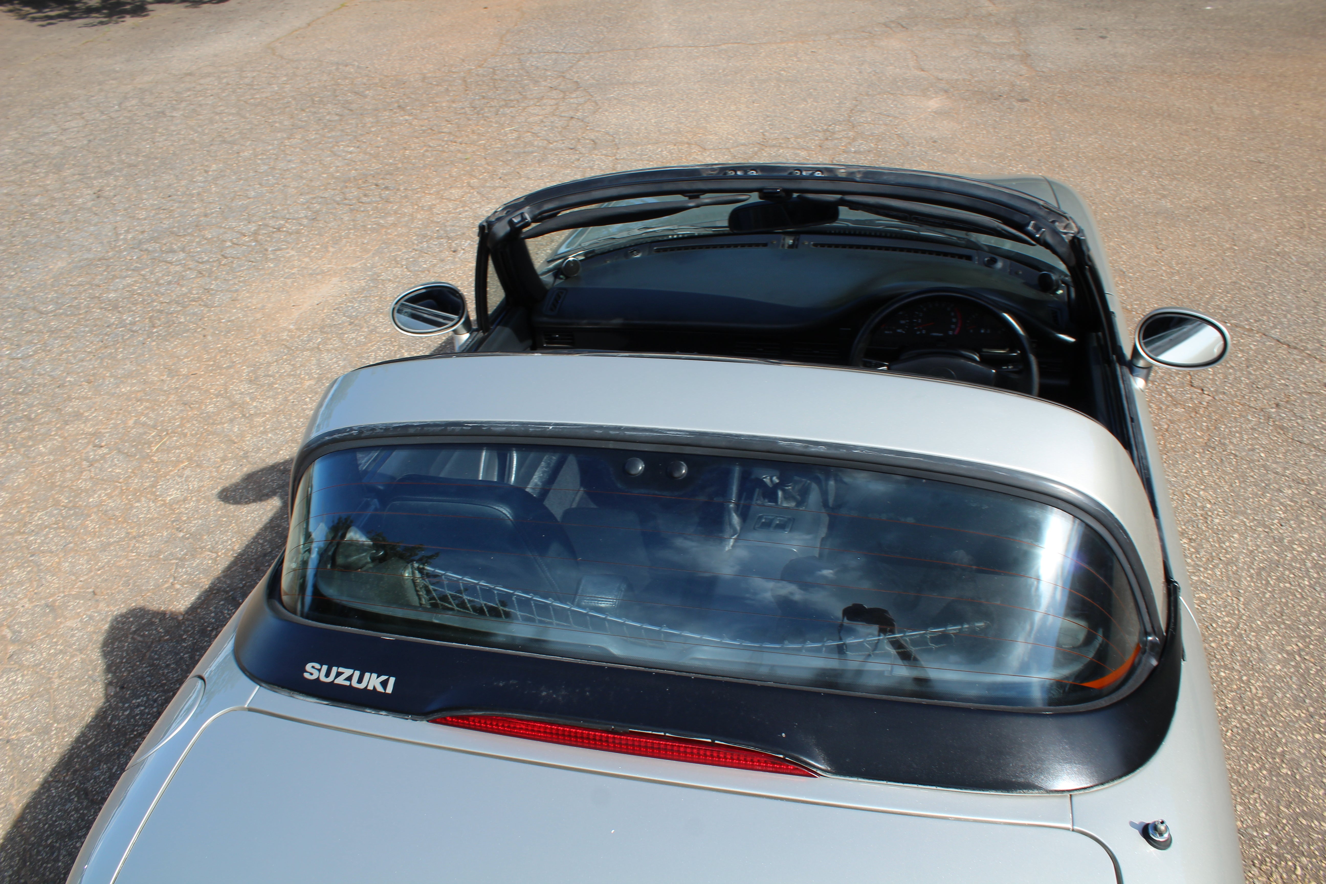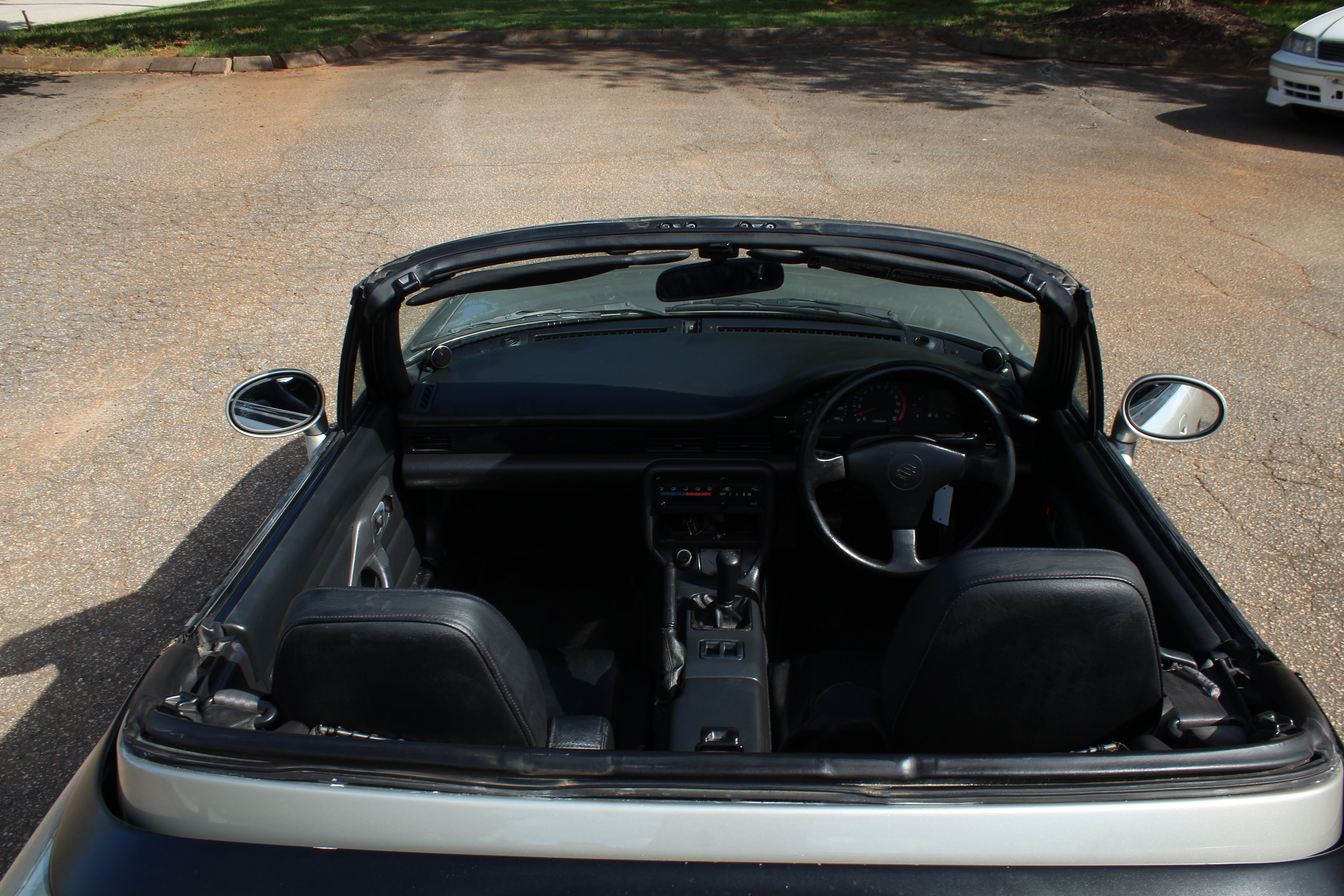 3 Cylinder Turbo Manual Sporty Kei car, weighs in at around 1600lbs, 50/50 weight distribution, fun little cars to drive. The Roof is 3 panels and the rear glass folds back, something really different from any other car.