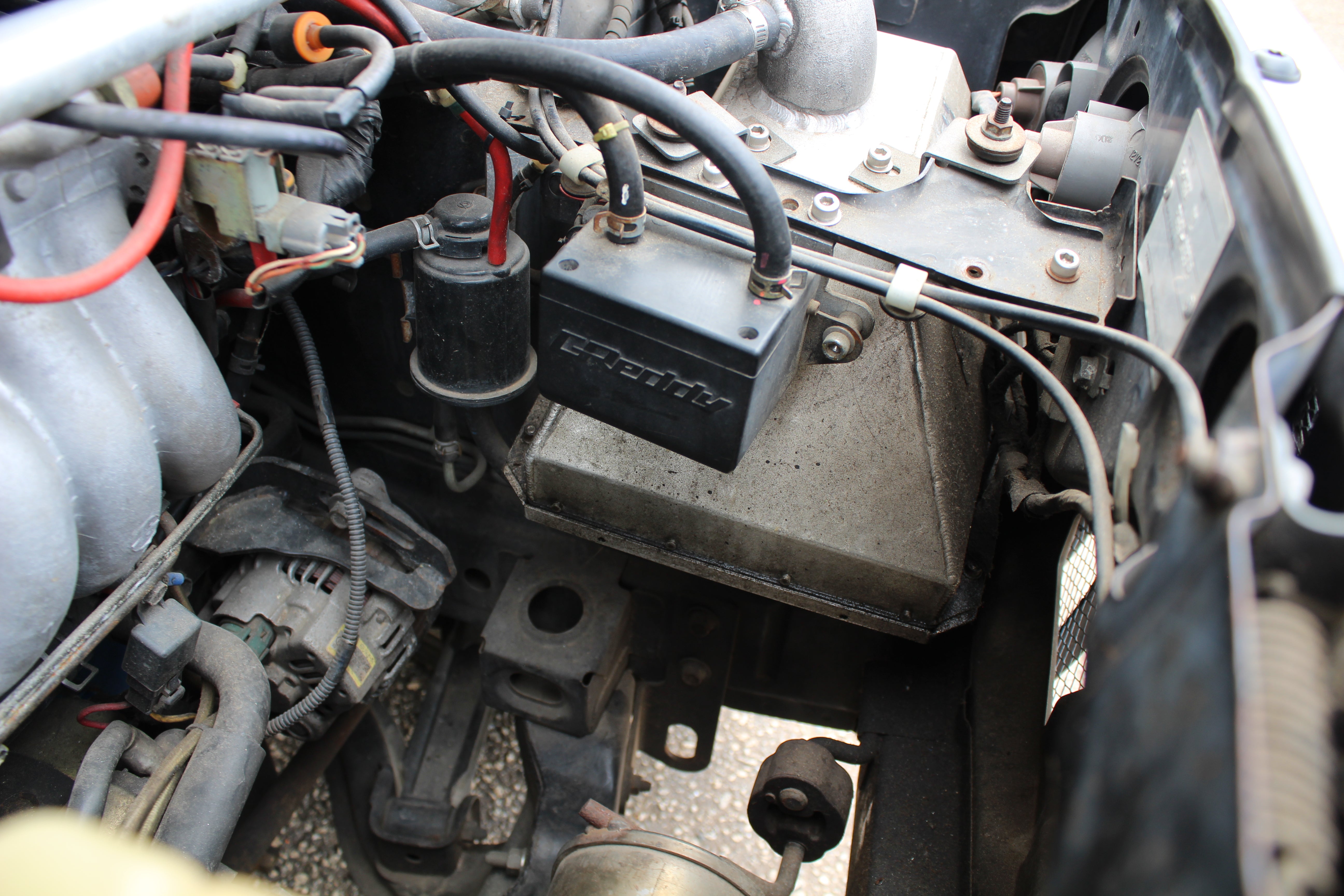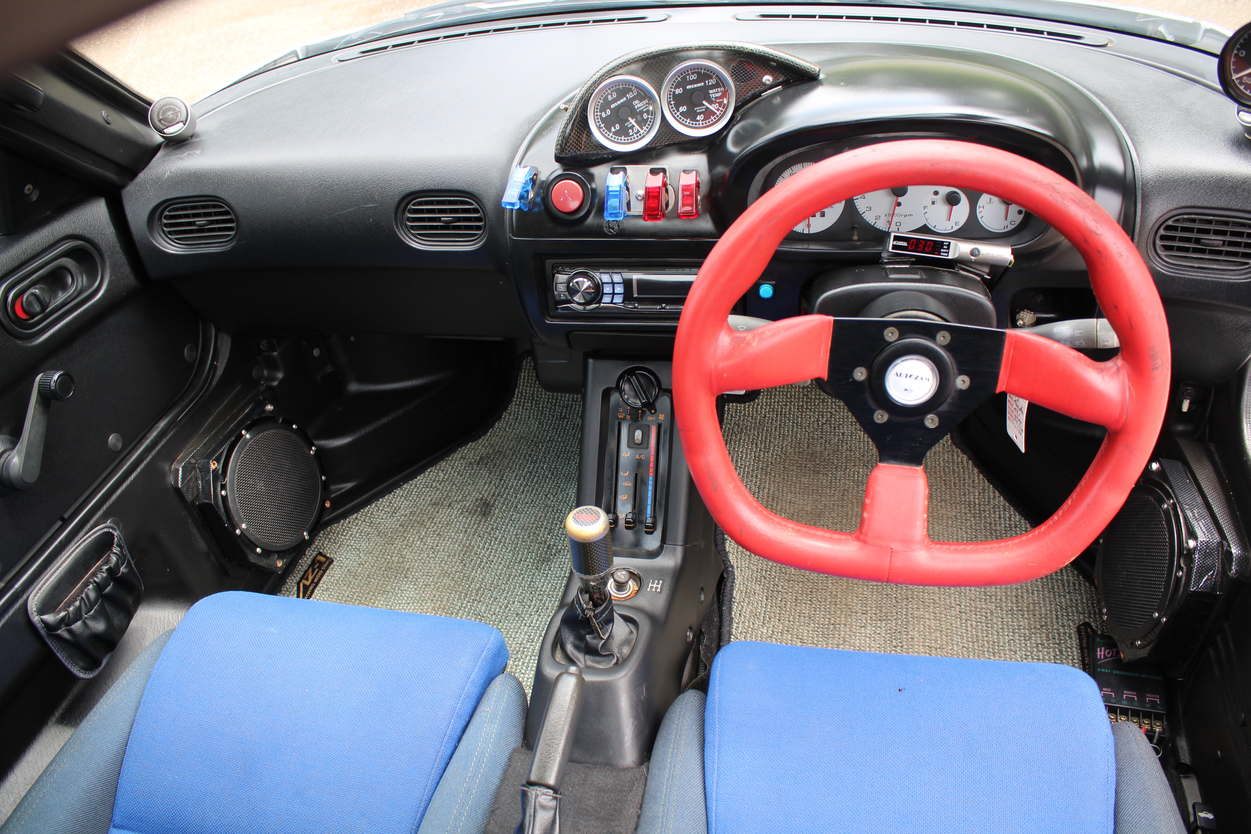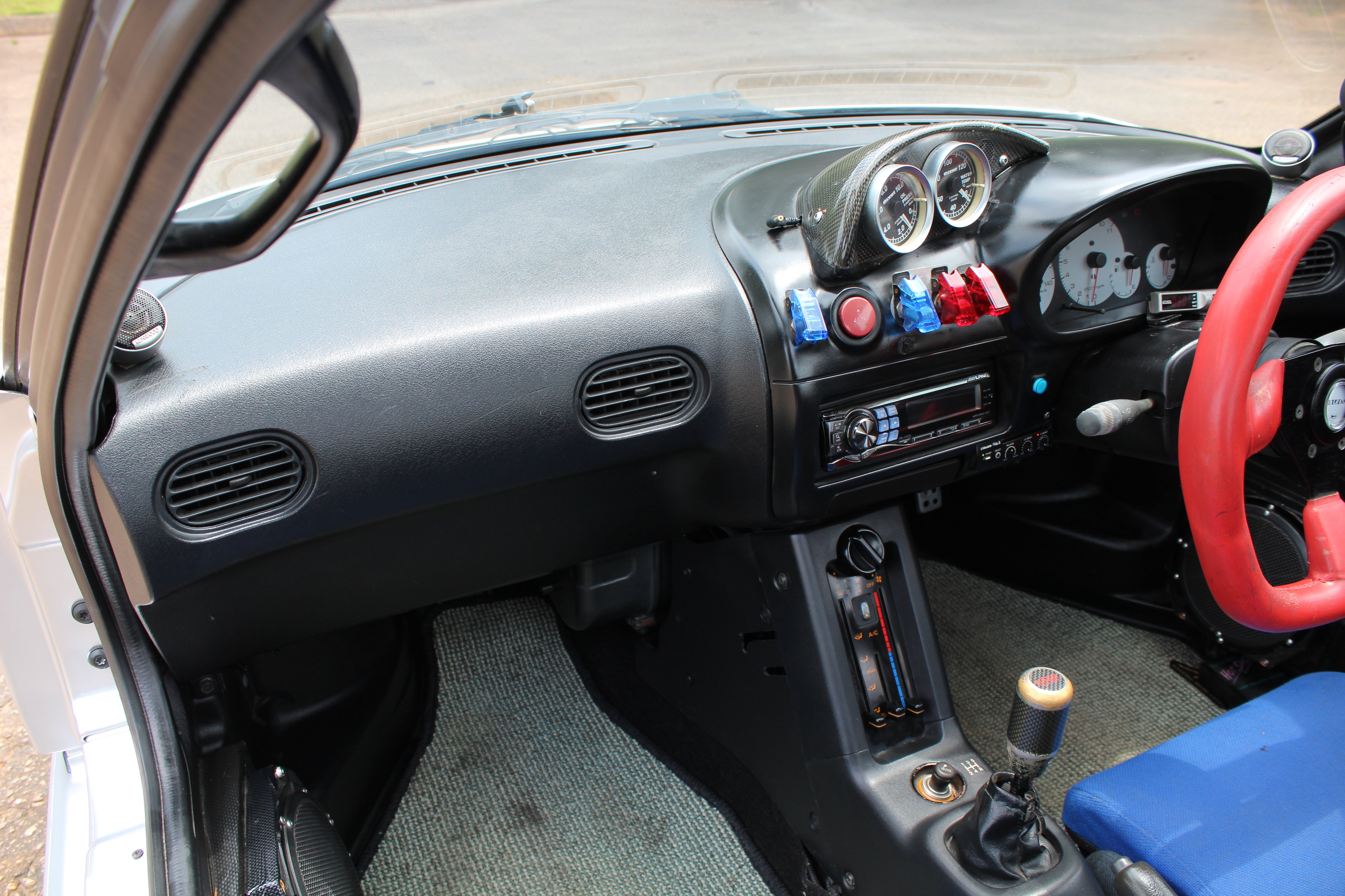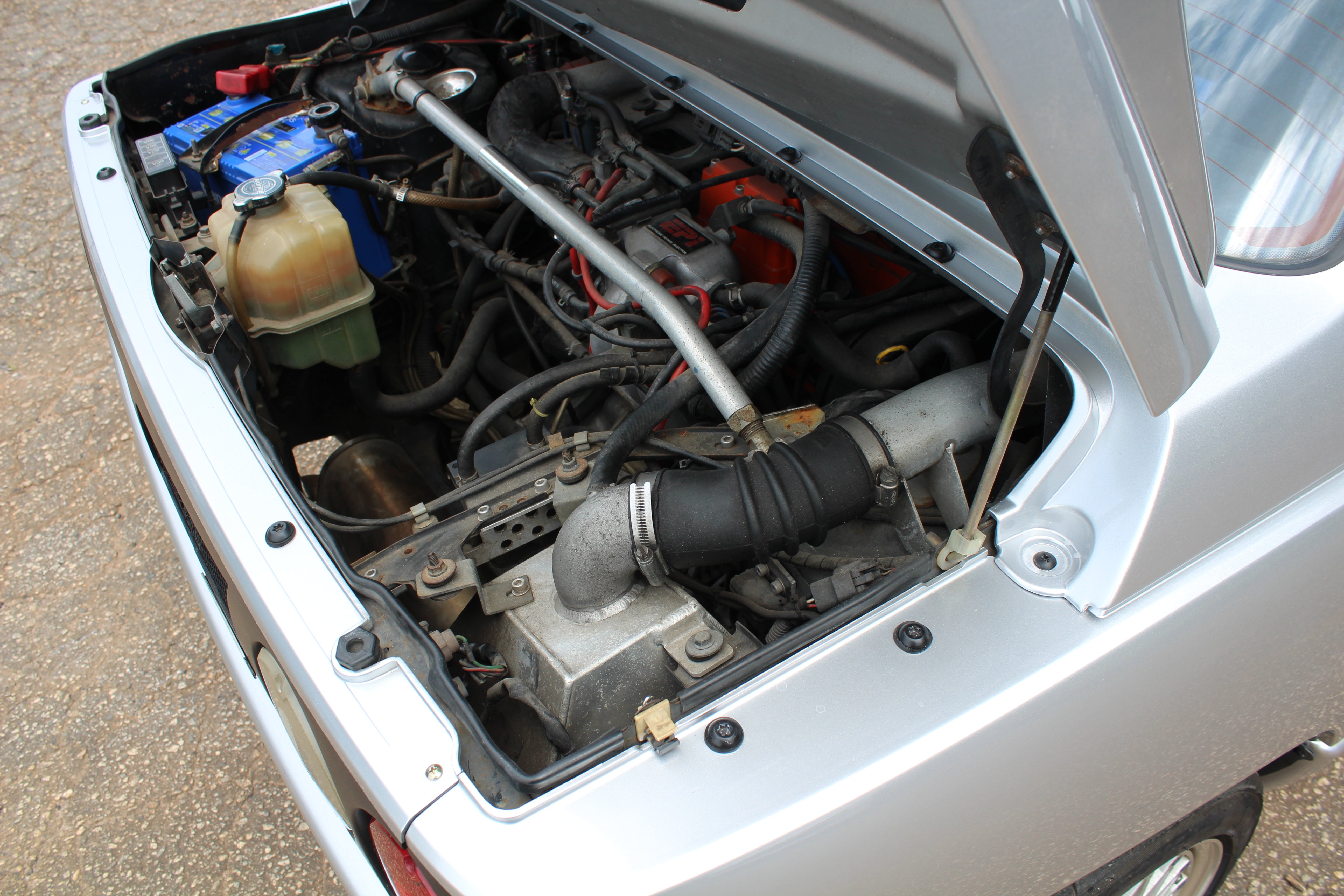 Engine Upgrades: Built engine with blue-painted block and orange valve cover, aftermarket suspension, exhaust, ARC intake box, blow-off valve, boost controller, and gauges