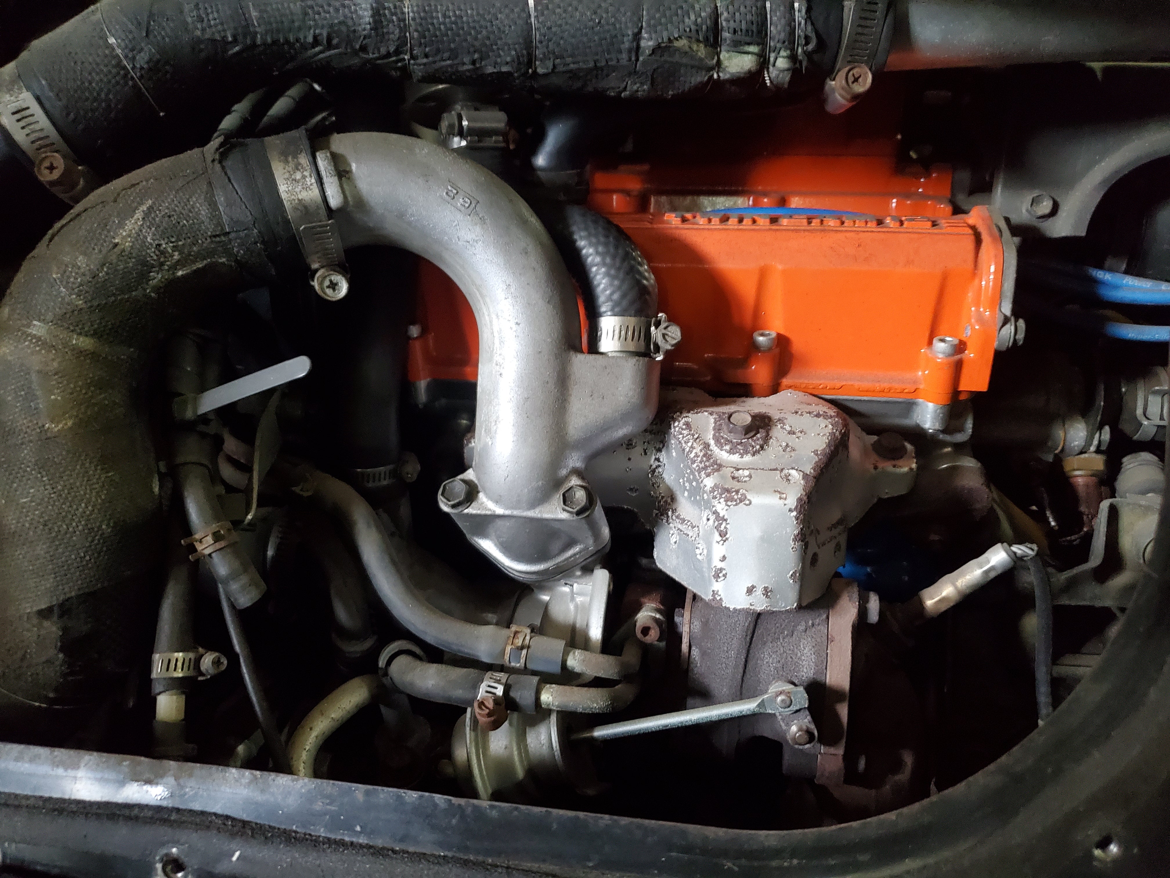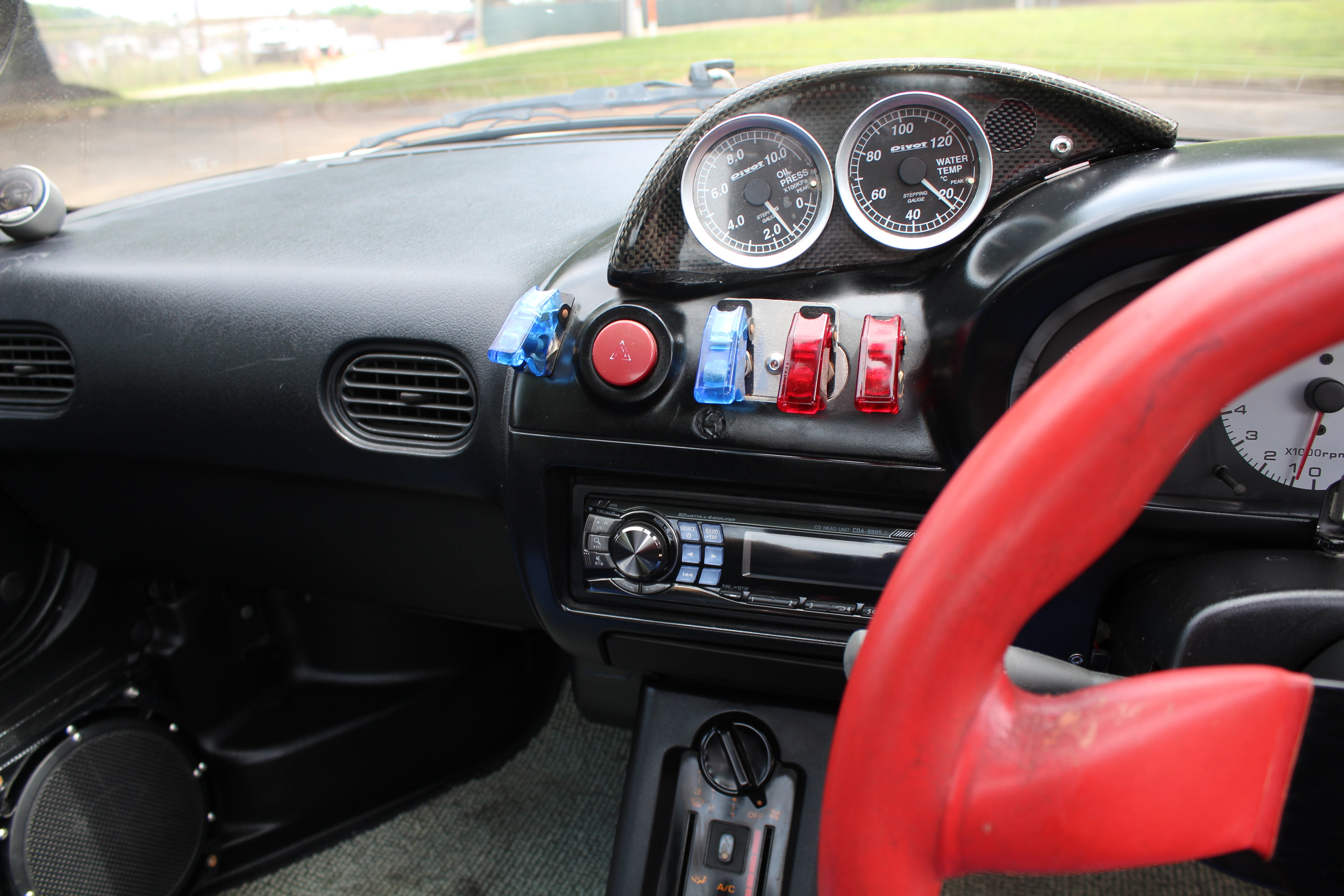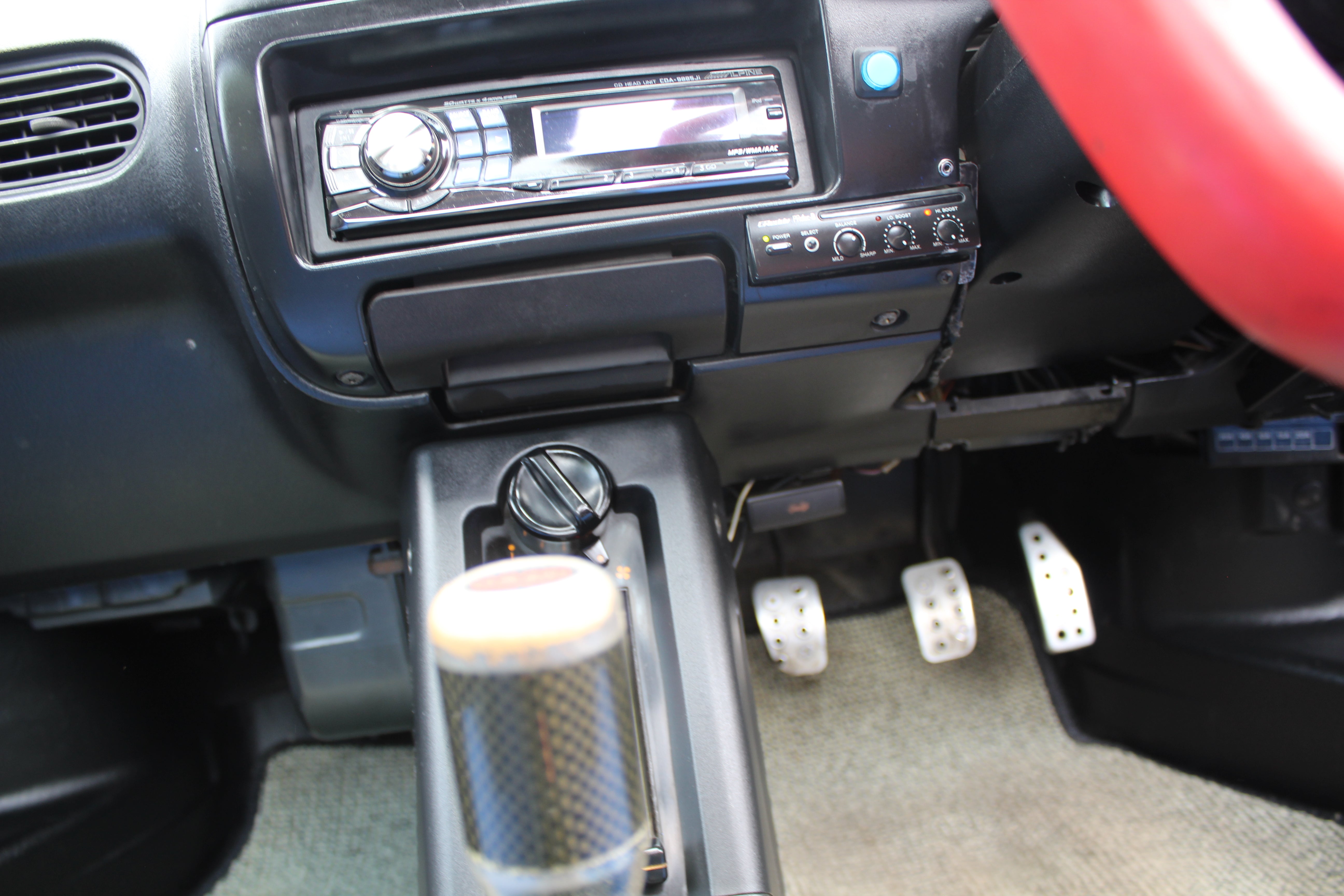 Engine Upgrades: Built engine with blue-painted block and orange valve cover, aftermarket suspension, exhaust, ARC intake box, blow-off valve, boost controller, and gauges