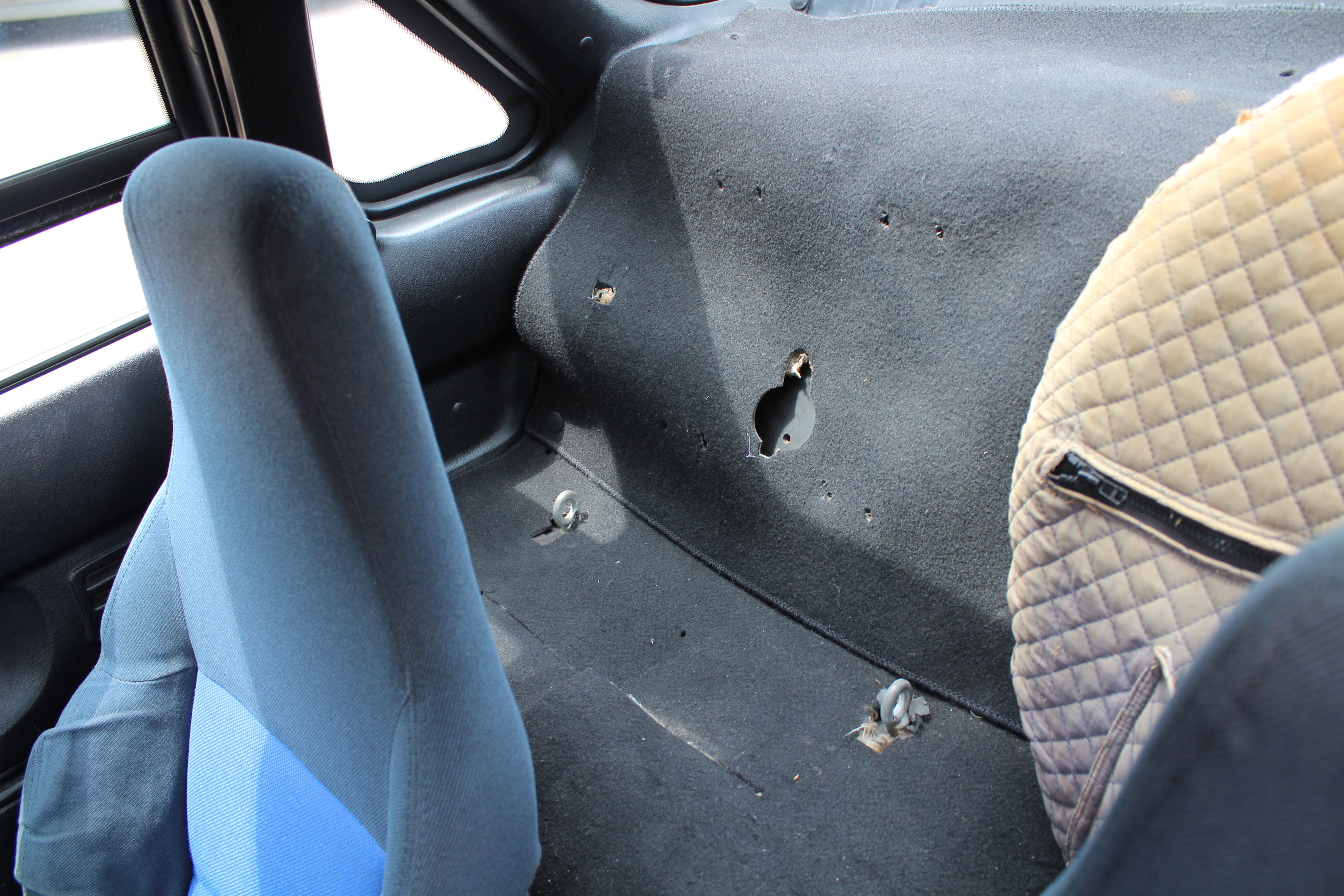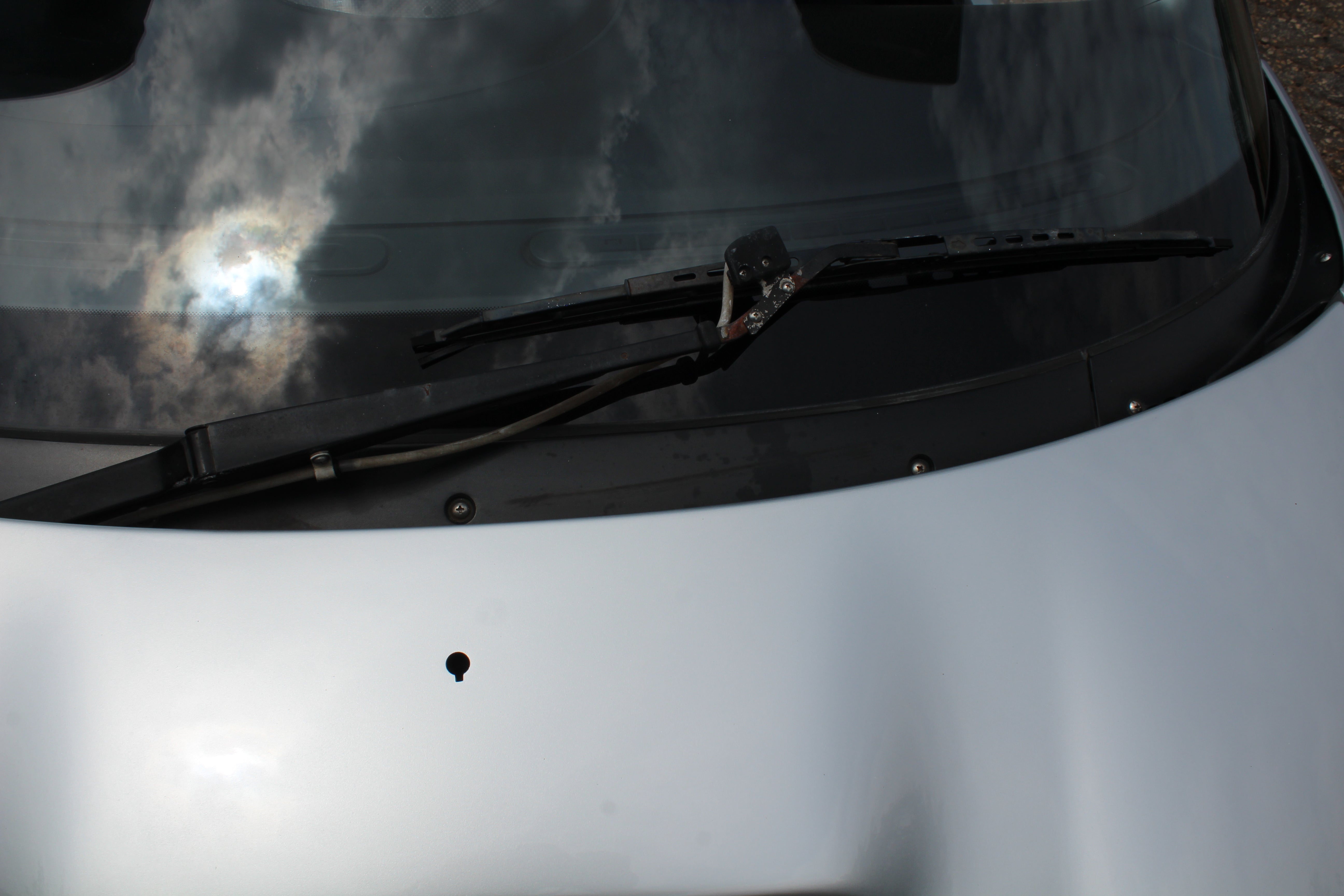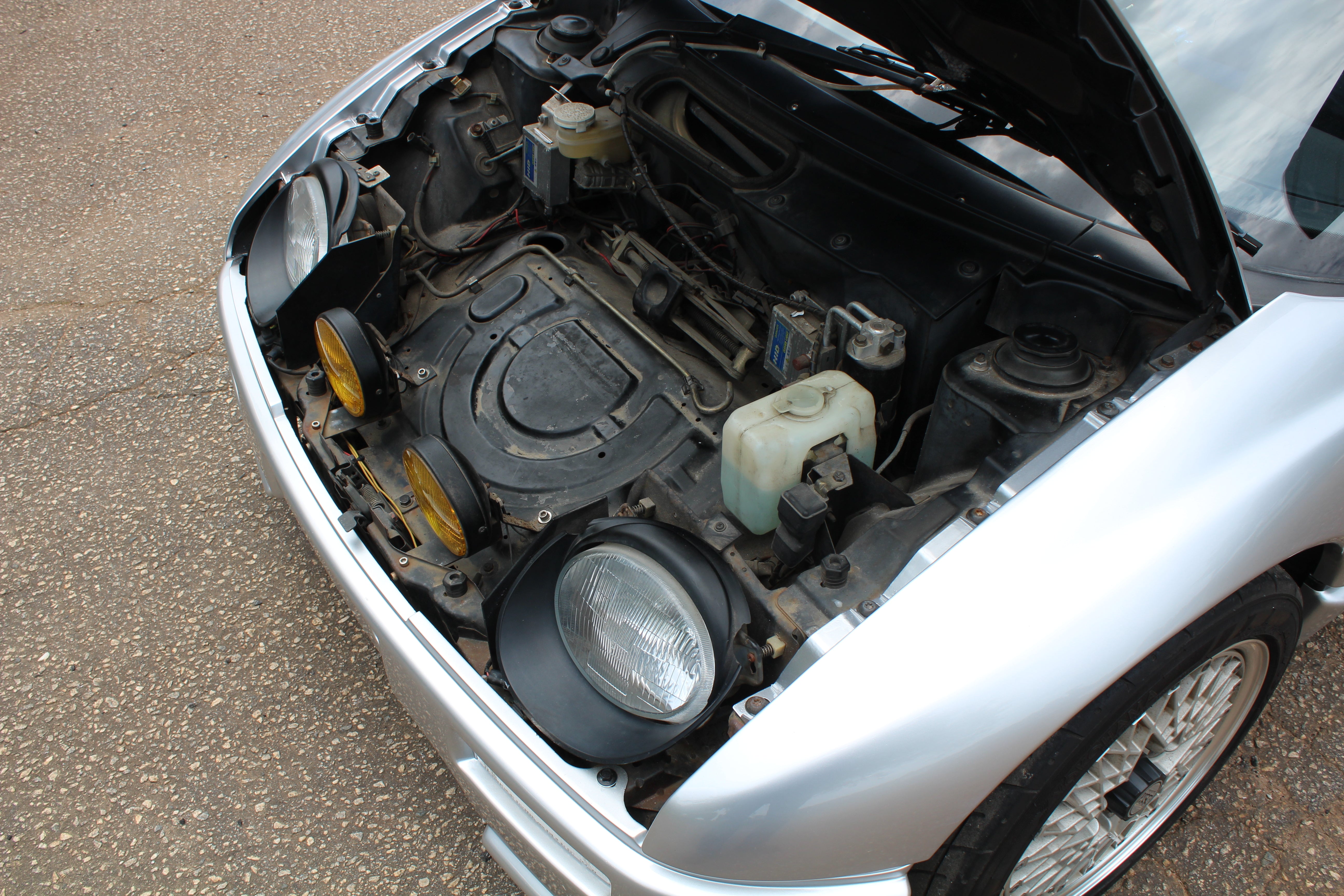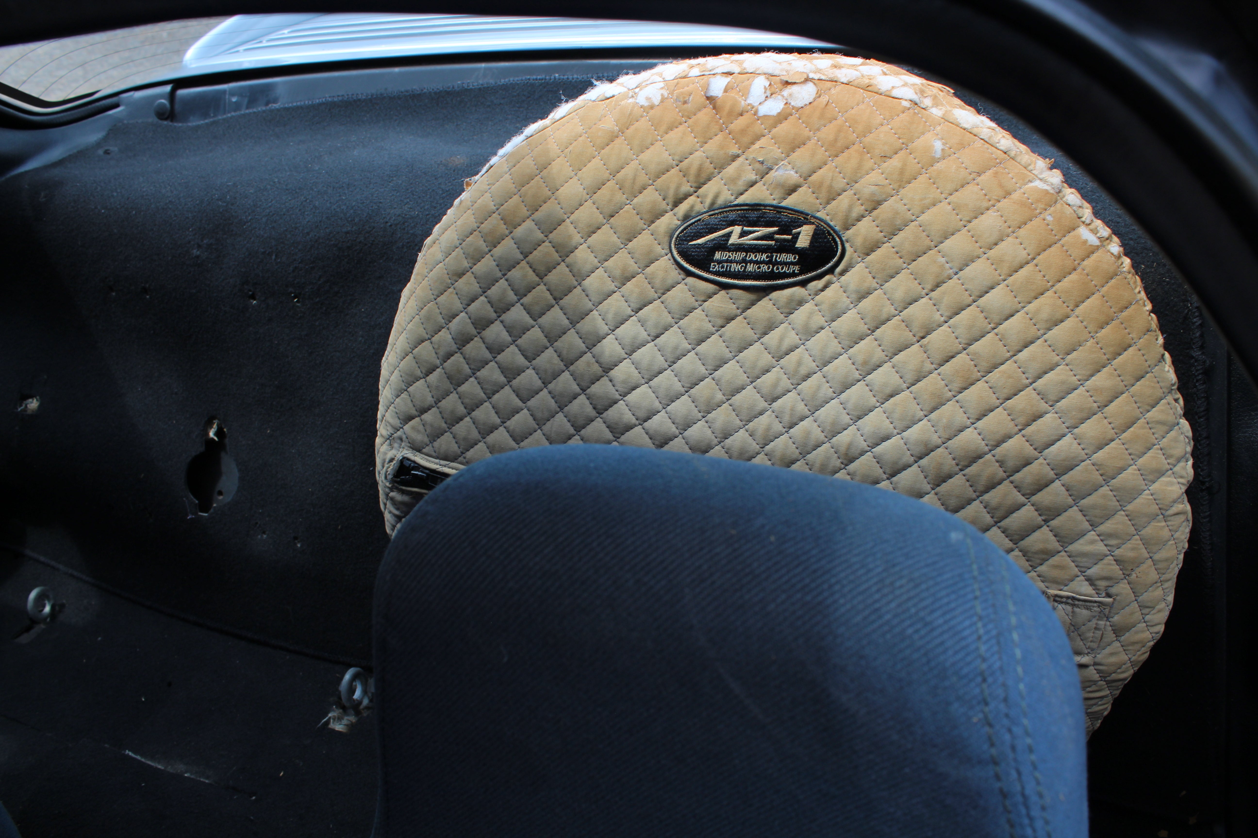 Interior: Driver seat shows wear with a cigarette burn, spare tire cover has sun fading, factory wiper squirter relocated from the hood to the wiper (hole in the hood from original placement)