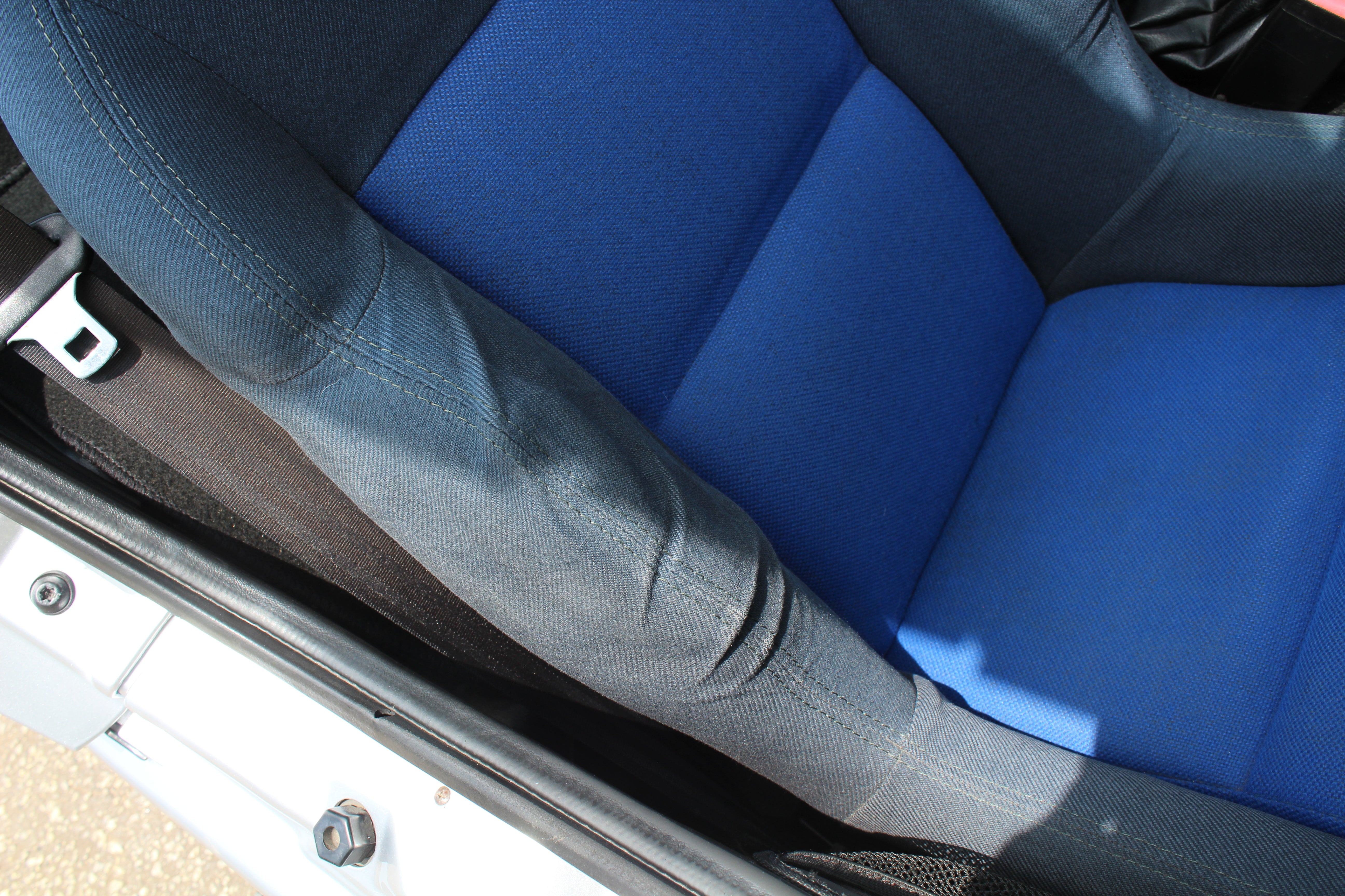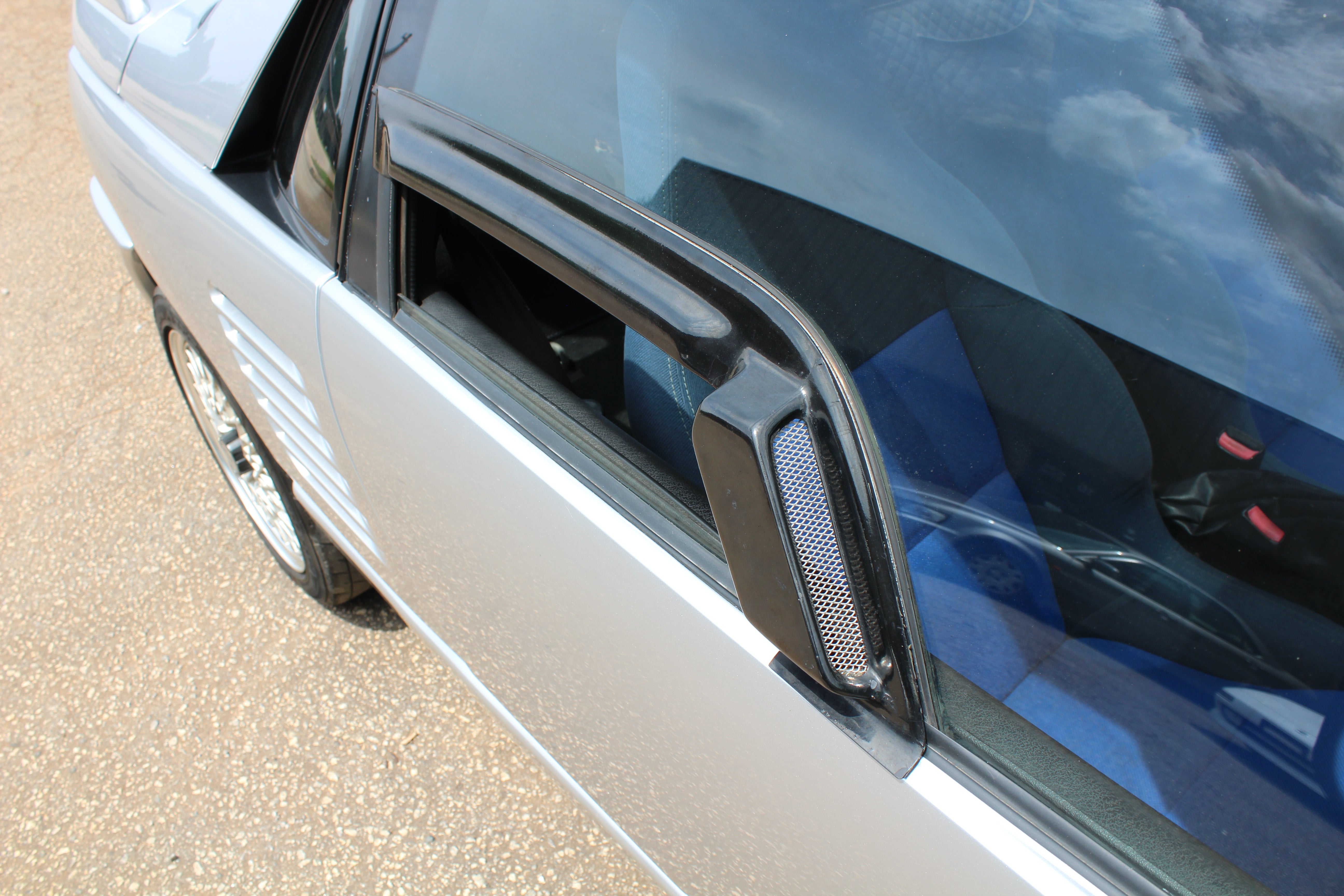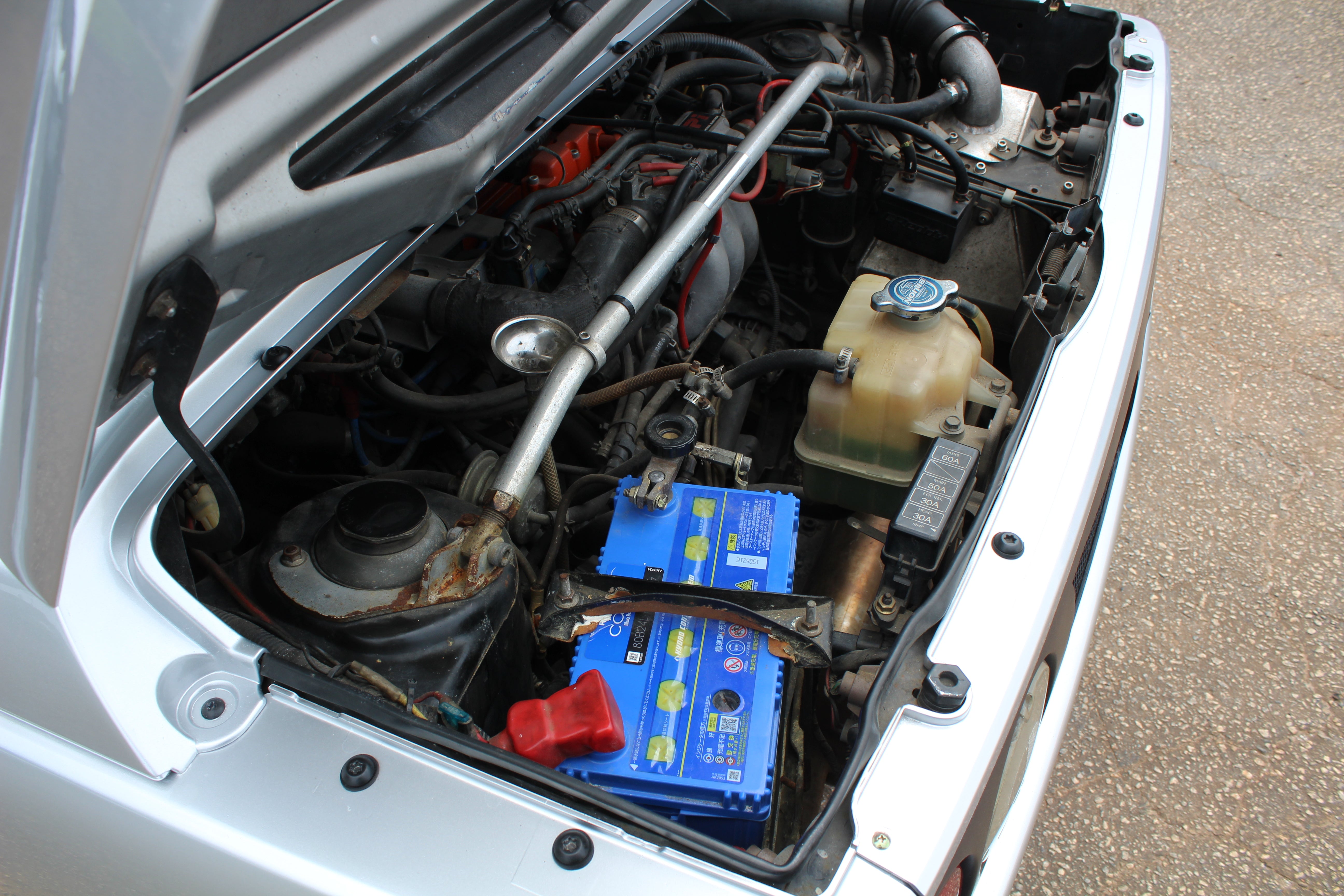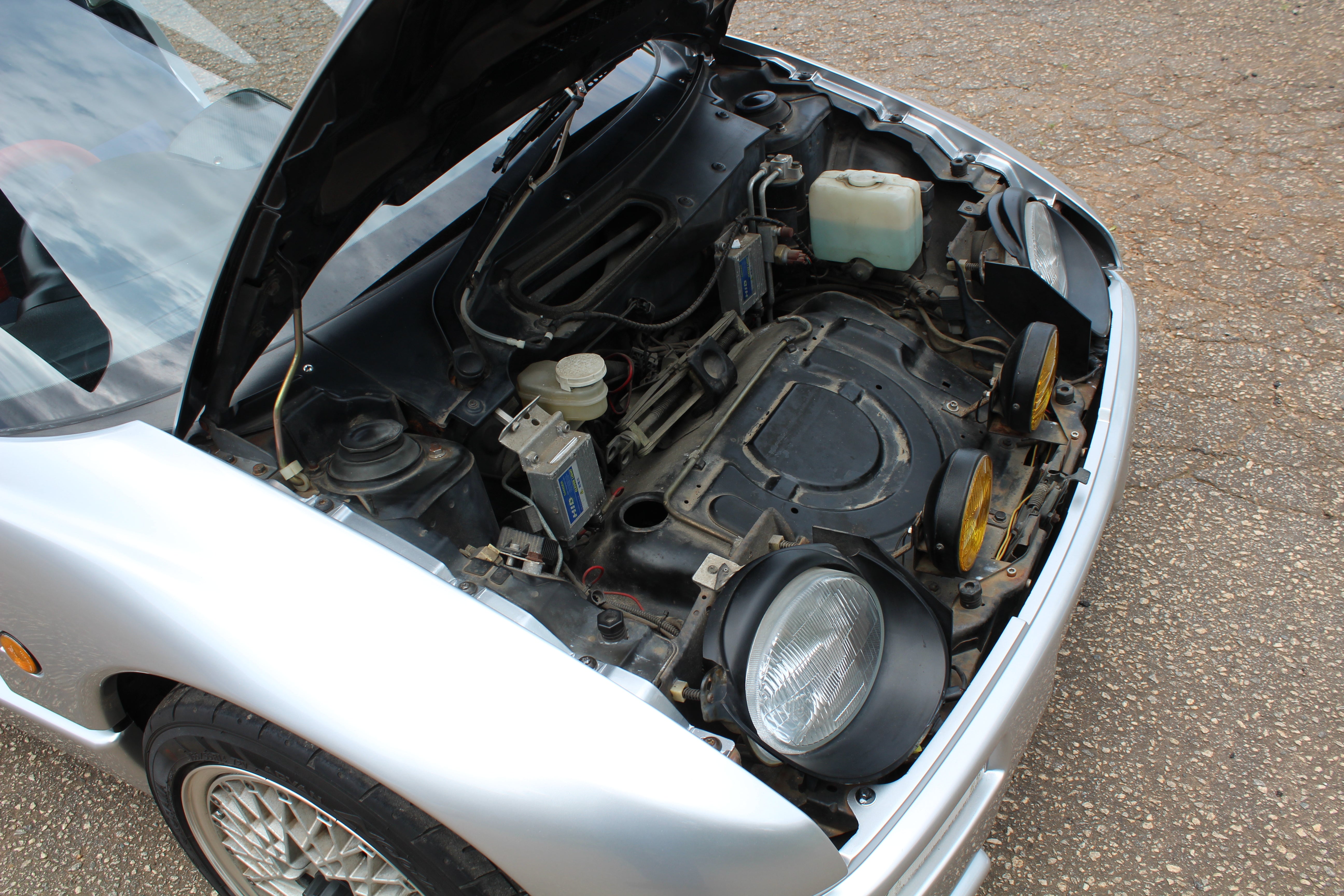 Interior: Driver seat shows wear with a cigarette burn, spare tire cover has sun fading, factory wiper squirter relocated from the hood to the wiper (hole in the hood from original placement)