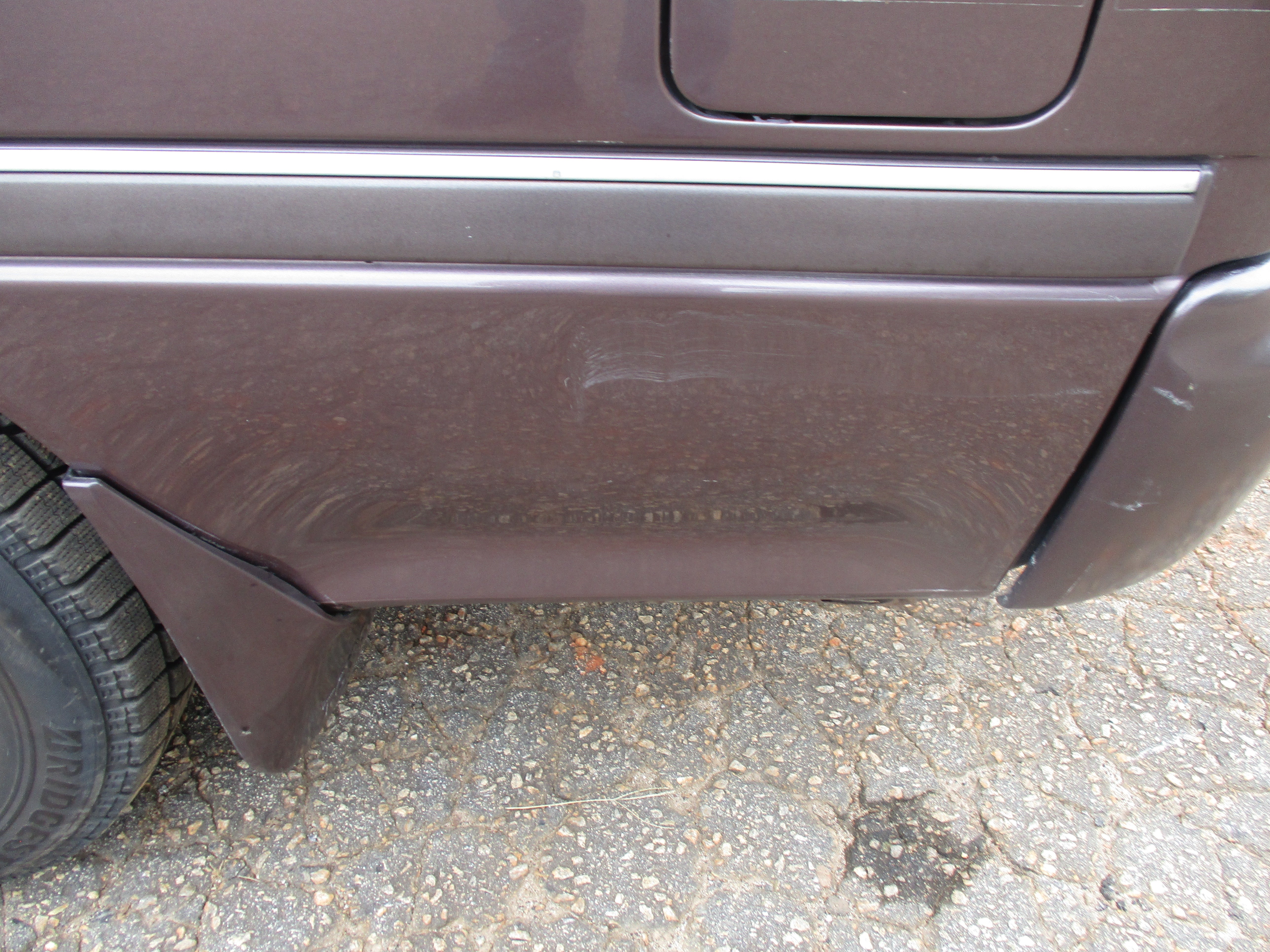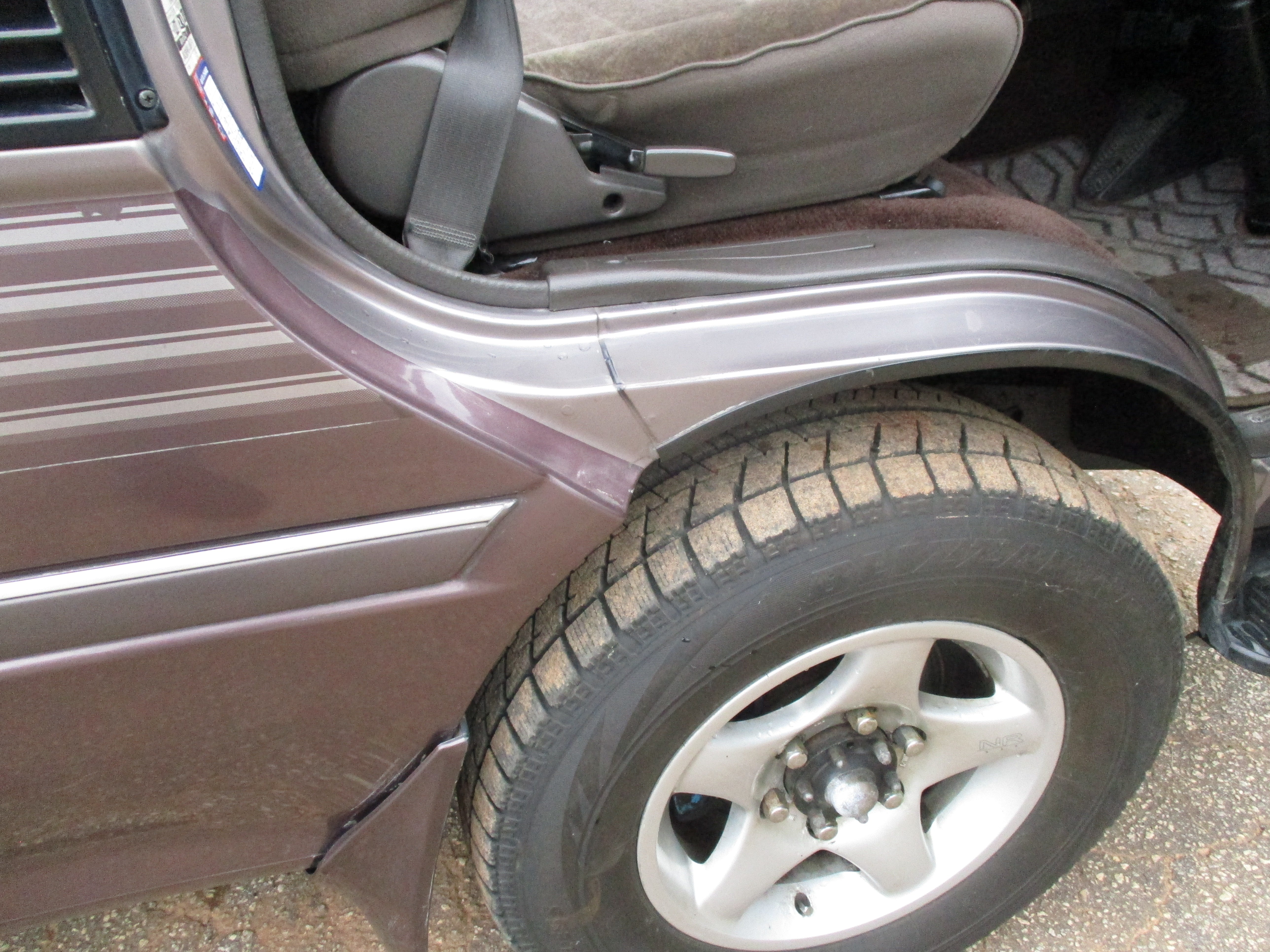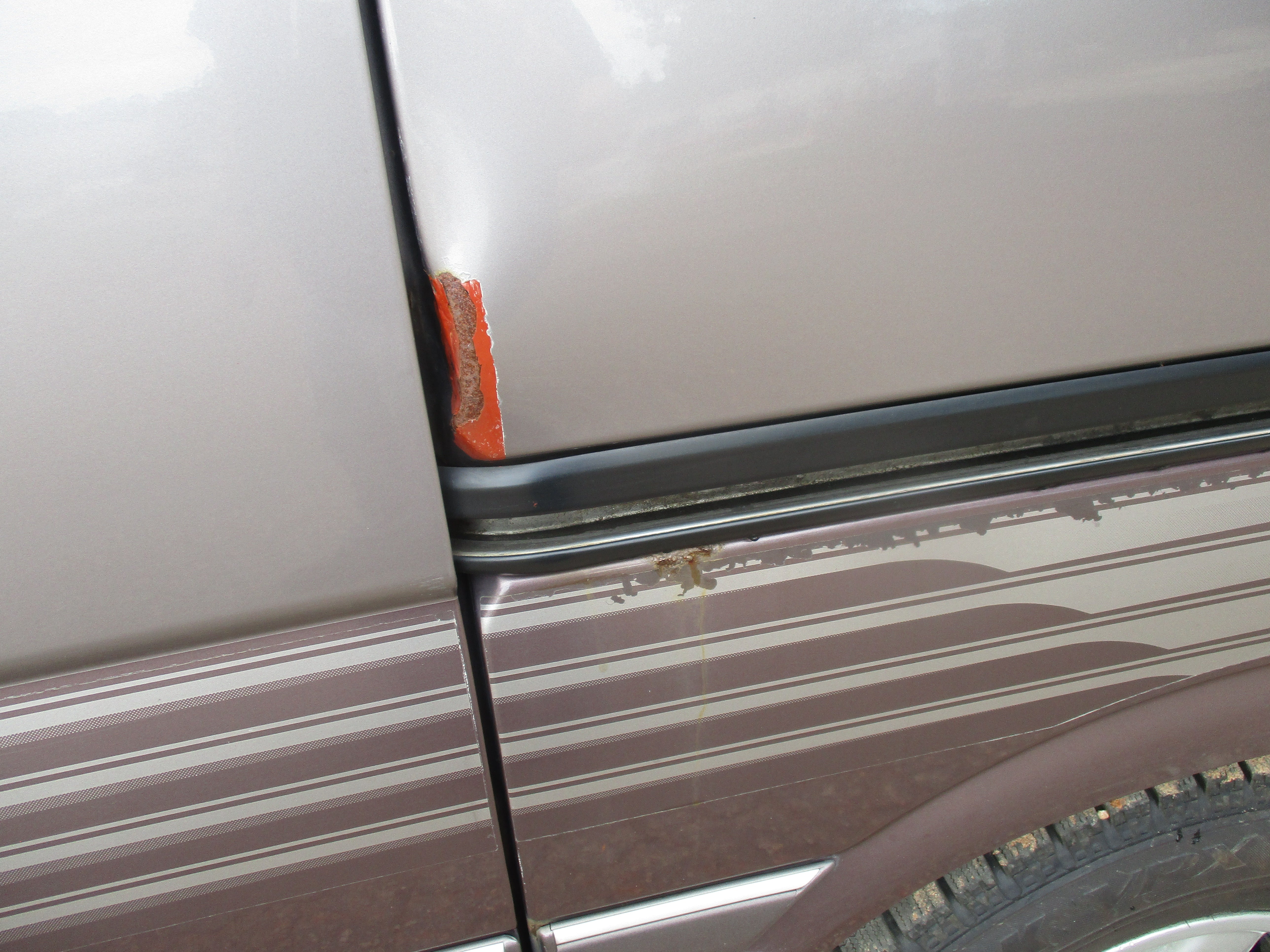 Has some scuffs on rear bumper corners, front bumper left corner, rust around bottom of driver door(only spot), and then looks like something got caught on the sliding door and put a dent in quarter as pictured.