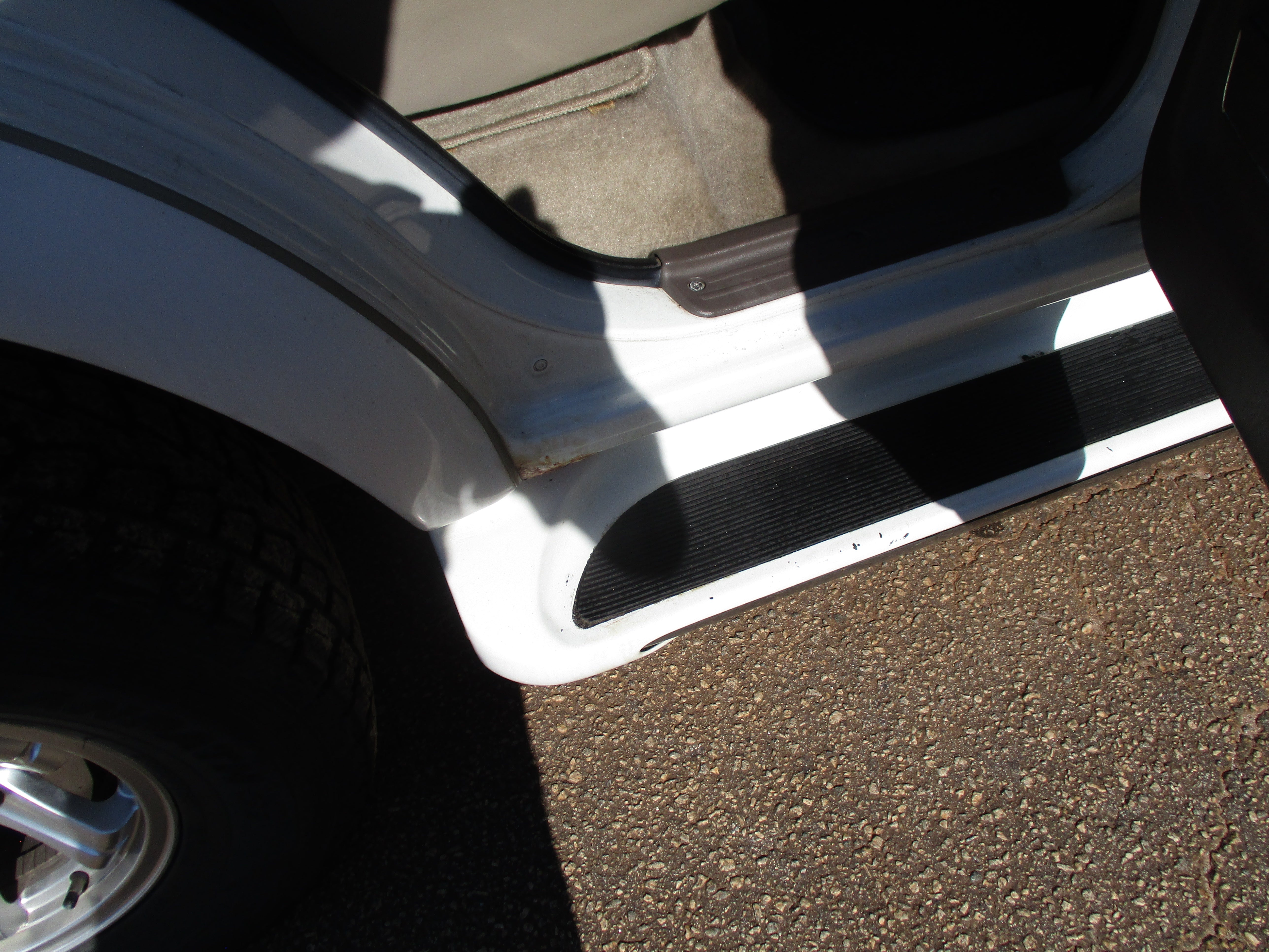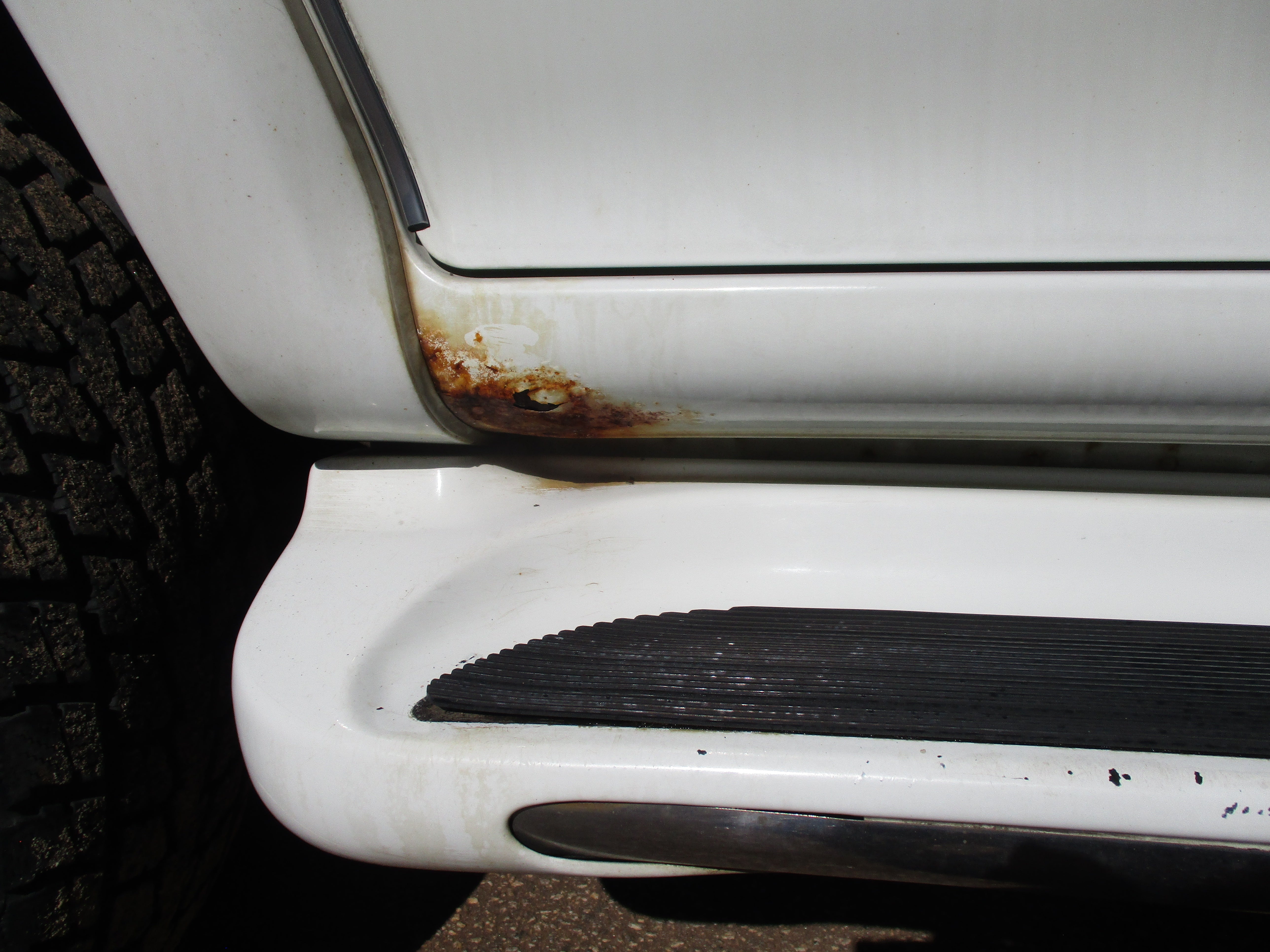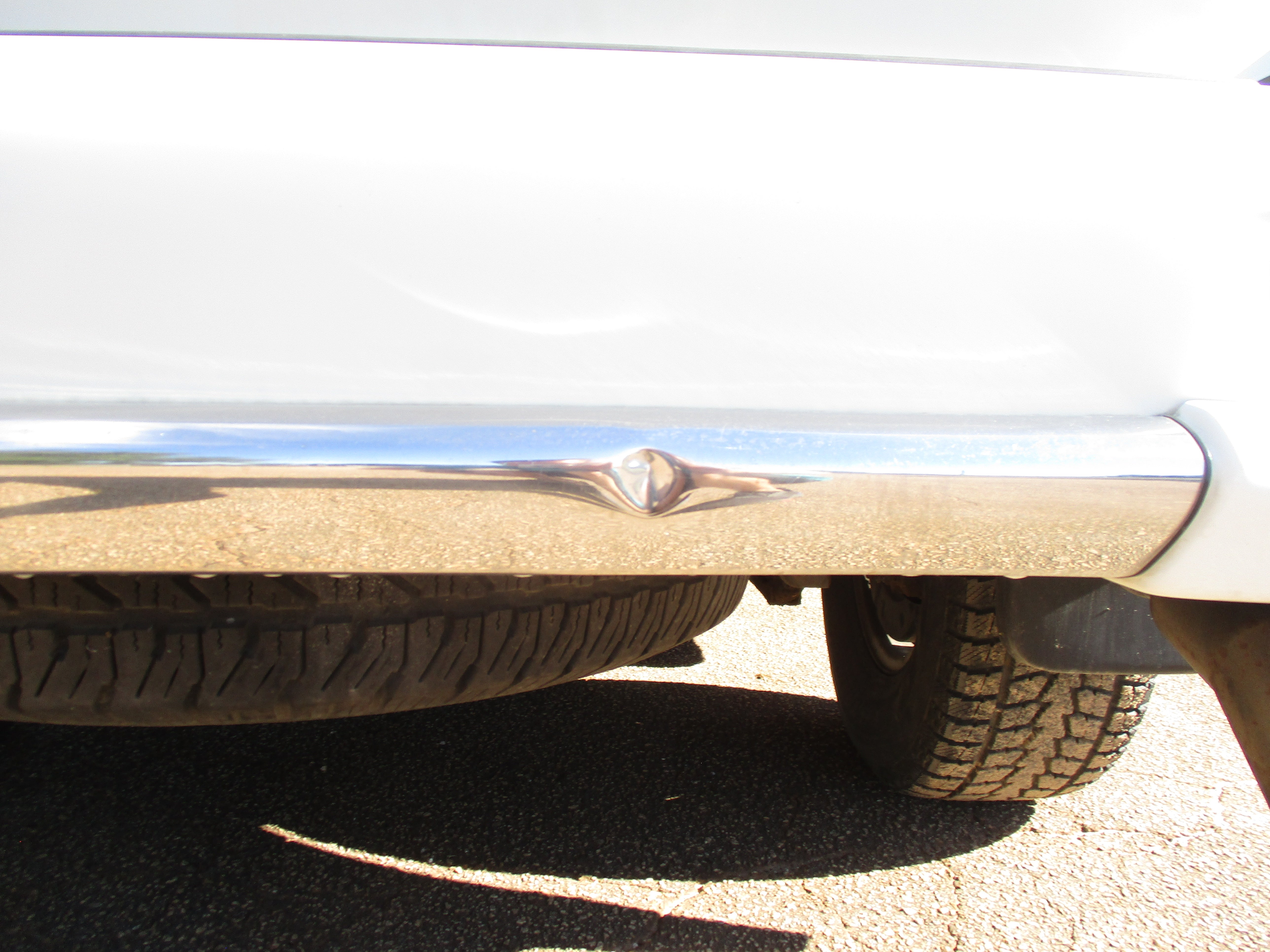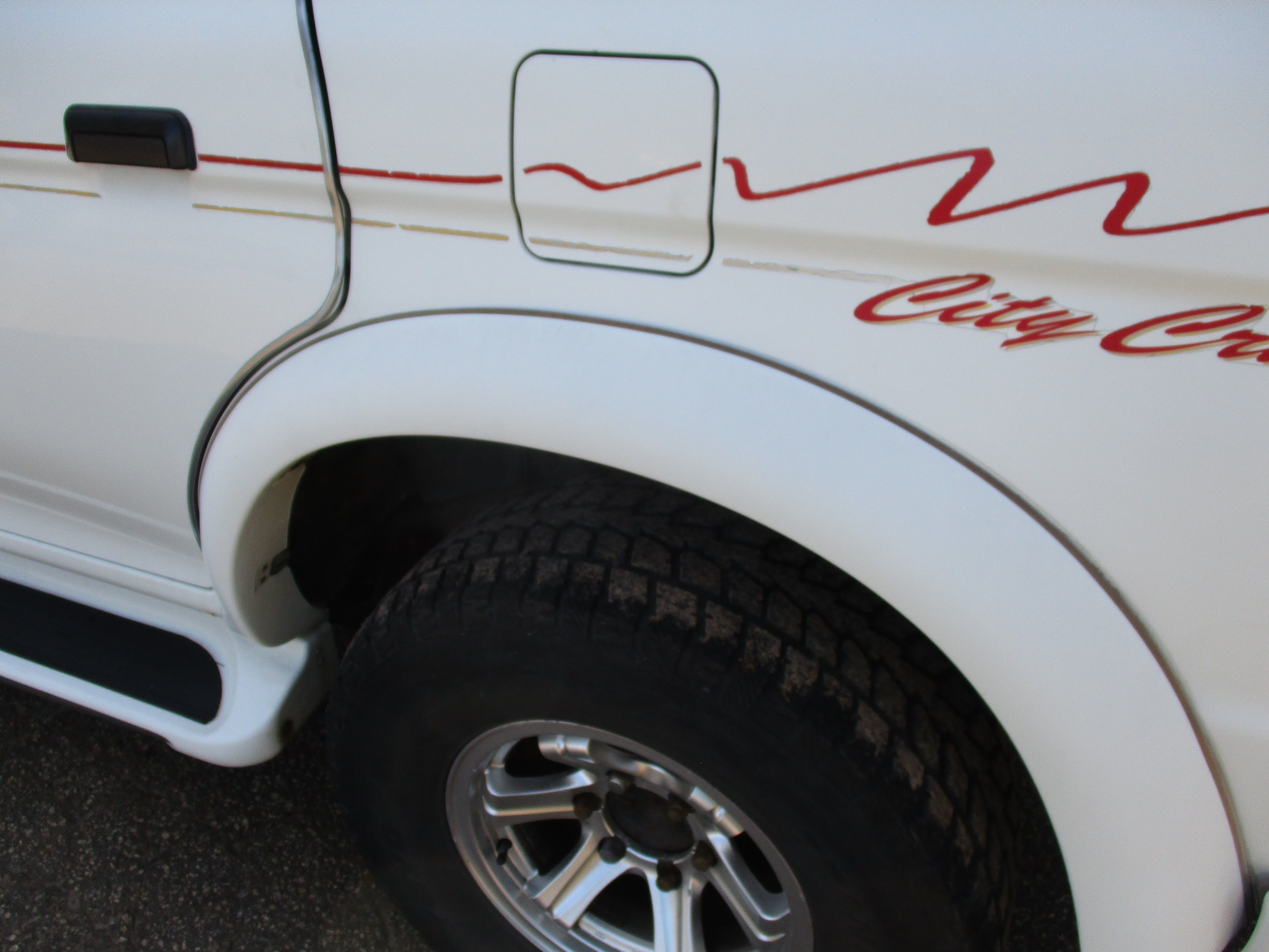 Exterior paint is in good condition, sporty rear spoiler and front grill option, has some scuffs as pictured on front and rear bumpers, small rust starting in front of rear wheel wells by both doors as pictured. Hood Scoop has paint fade and front fender flares paint starting to get dull. Right running board has some wear as pictured. Leather front seats have some wear.