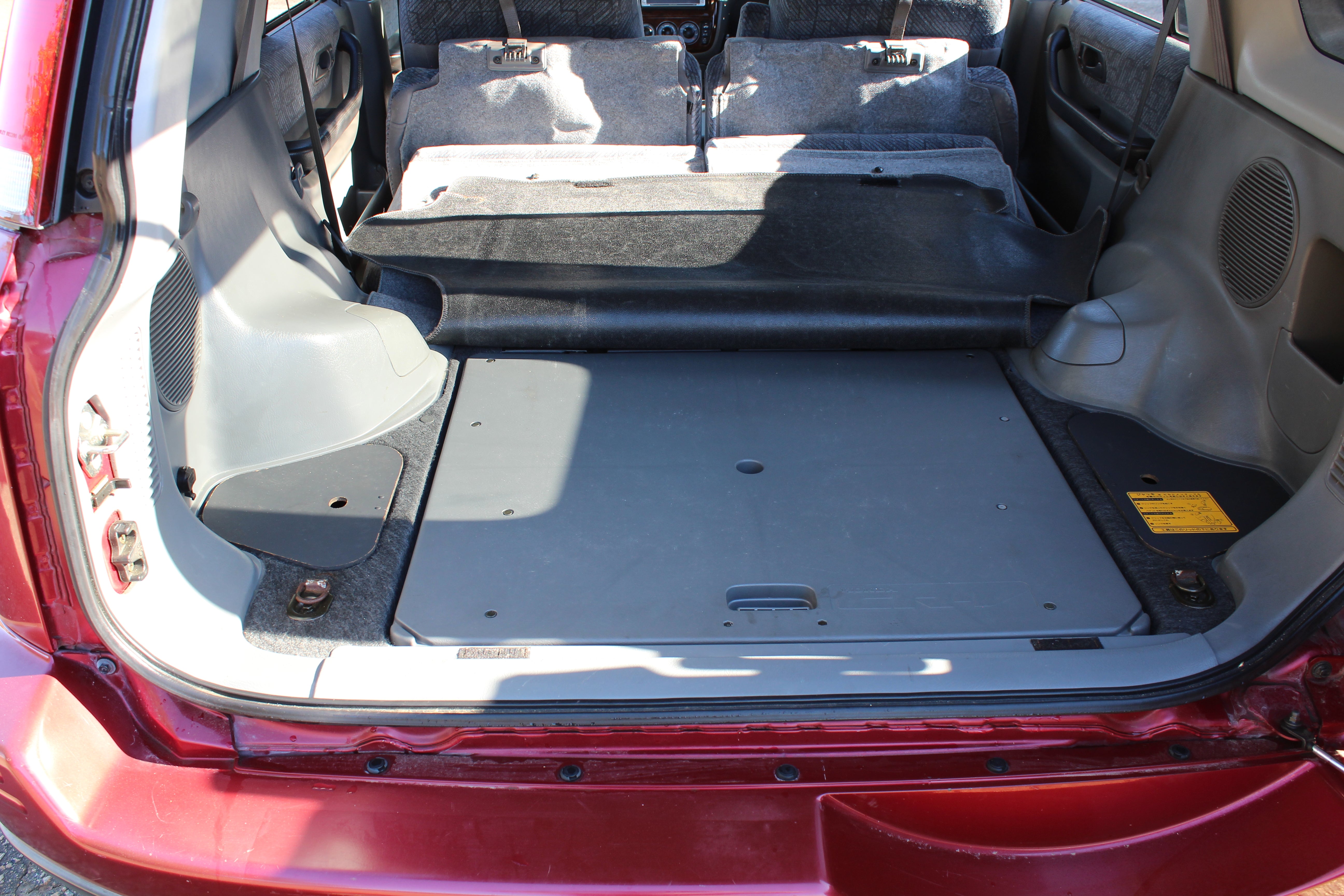 The first generation CR-V or RD1 was Honda's first in-house designed sport utility vehicle by Hiroyuki Kawase. The CR-V was introduced in Japan at Honda Verno dealerships only and was regarded as a luxury vehicle in Japan due to the exterior width dimensions exceeding Japanese Government dimension regulations. For the North American market, it was displayed at the 1996 Chicago Auto Show and went on sale in February 1997. Upon introduction, the model had only one trim level, which would later be known as the LX model trim; it was powered by the 2.0-litre straight-four B20B producing 126 hp (94 kW) at 5400 rpm and 133 lb⋅ft (180 N⋅m) of torque at 4800 rpm. Outer dimensions for this engine would be identical to the Integra's 1.8 L engine, but internally the engine had a larger 84 mm (3.3 in) bore to add the extra displacement needed to produce more torque. The engine used a one-piece cylinder sleeve construction unique from any other B-series engine. The chassis was a unibody design with fully independent suspension. The front suspension was double-wishbone, while the rear used a trailing arm-based multilink system. Inside, the rear seats were able to fold down, and a picnic table was stowed in the rear floor area. All models featured plastic cladding covering the front bumper, rear bumper, and fender wells. In most countries, CR-Vs had a chrome grille; however, in the United States, the grille was made out of the same black plastic as the bumpers. The EX included anti-lock brakes and 15 inch alloy wheels over the LX trim. Drivetrain options were front-wheel drive or Honda's Real Time AWD.