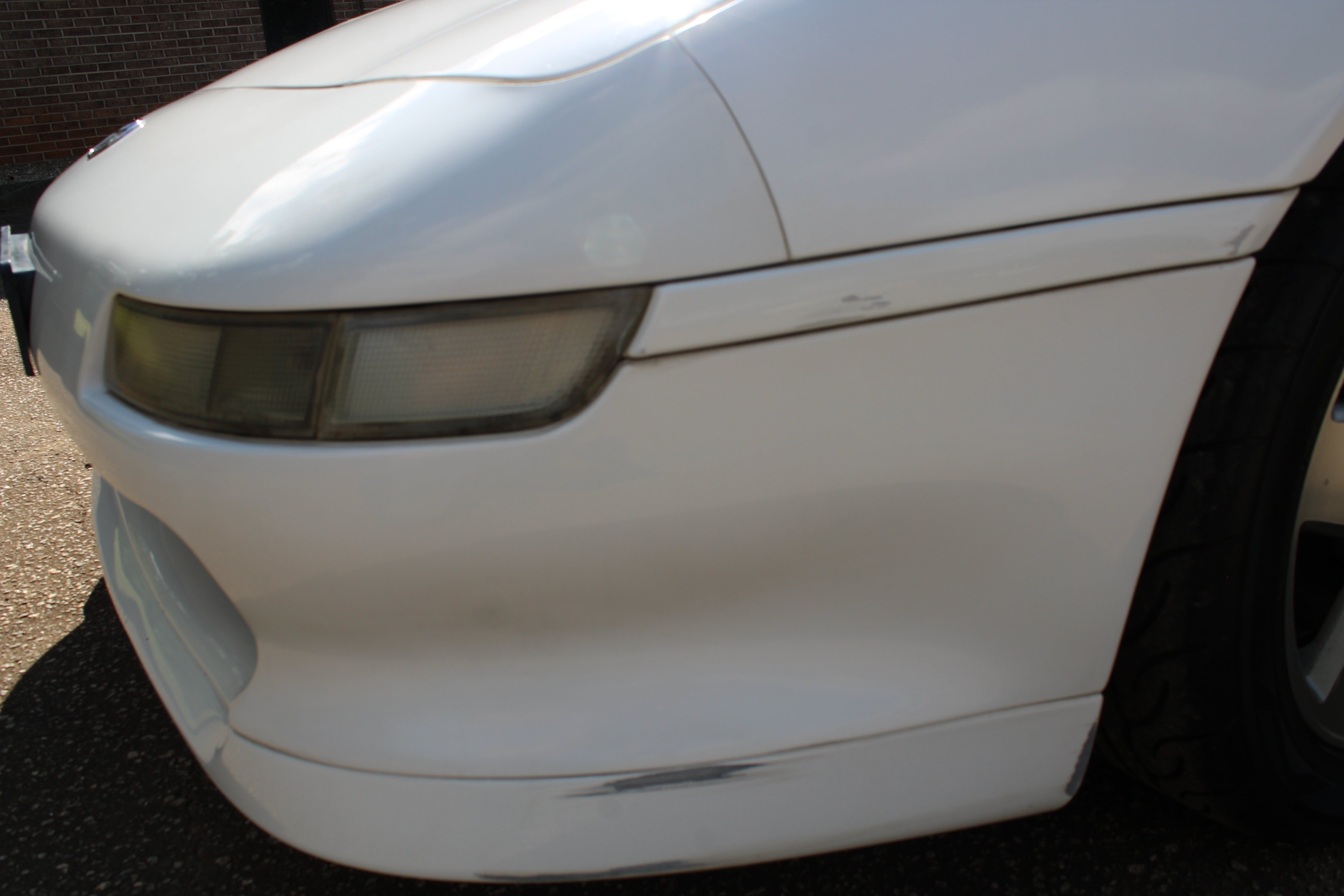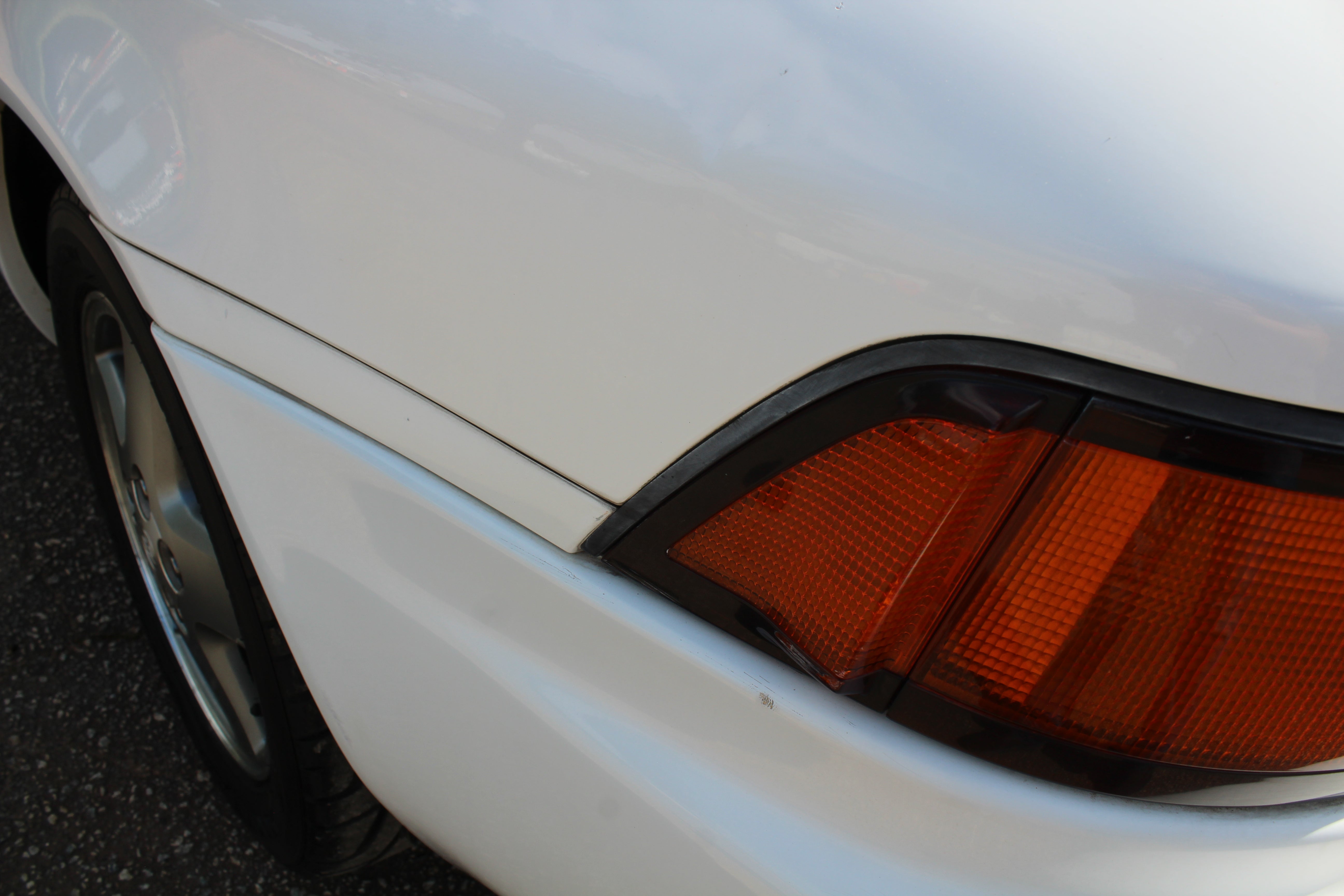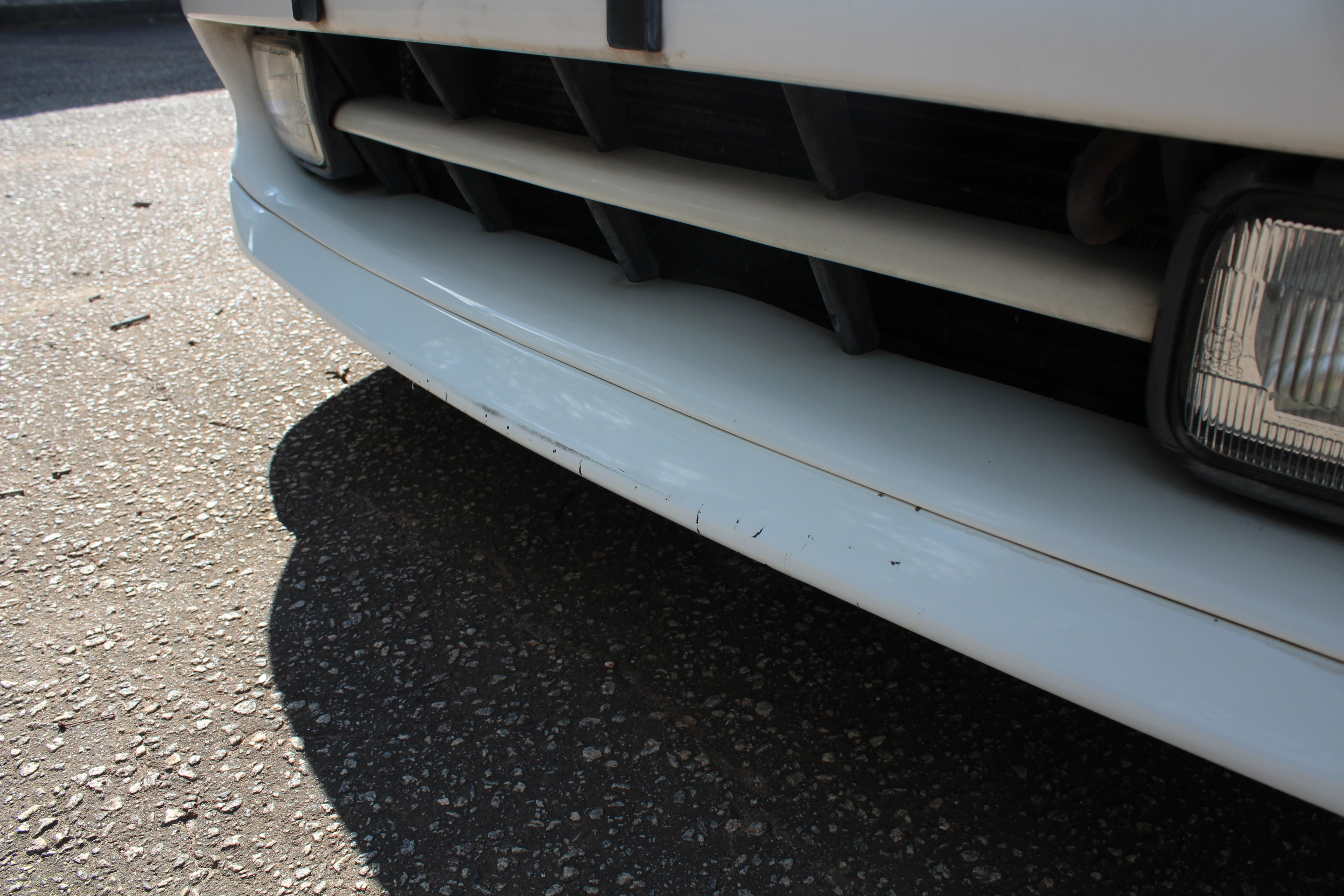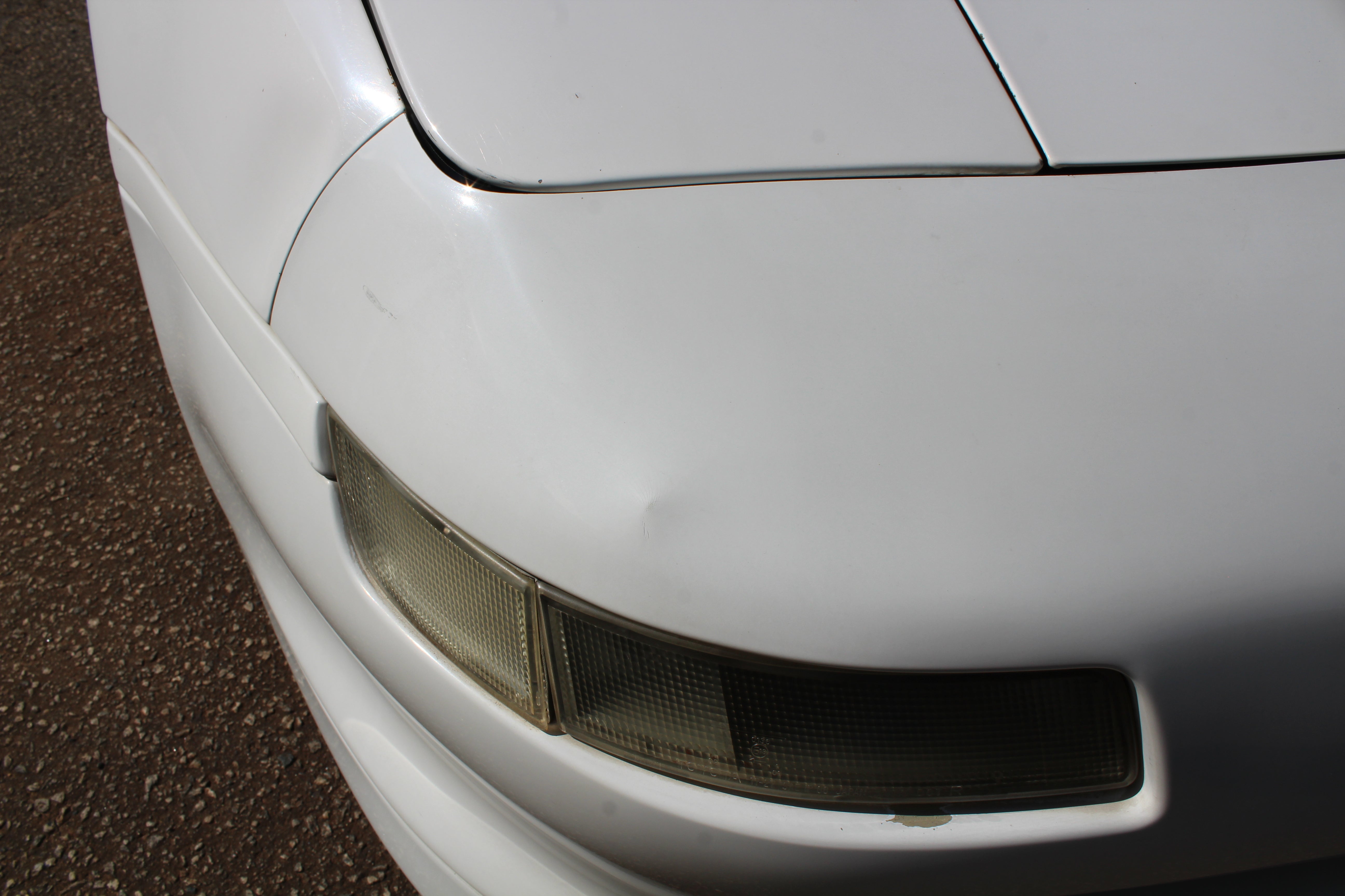 Small scuff on front right corner of bumper, small indent on right fender, small scratch on right induct vent, rear bumper on corner has some paint crack from indent, small scuff on rear left quarter, scuff on front left bumper corner and nicks on front lip. All flaws are pictured.