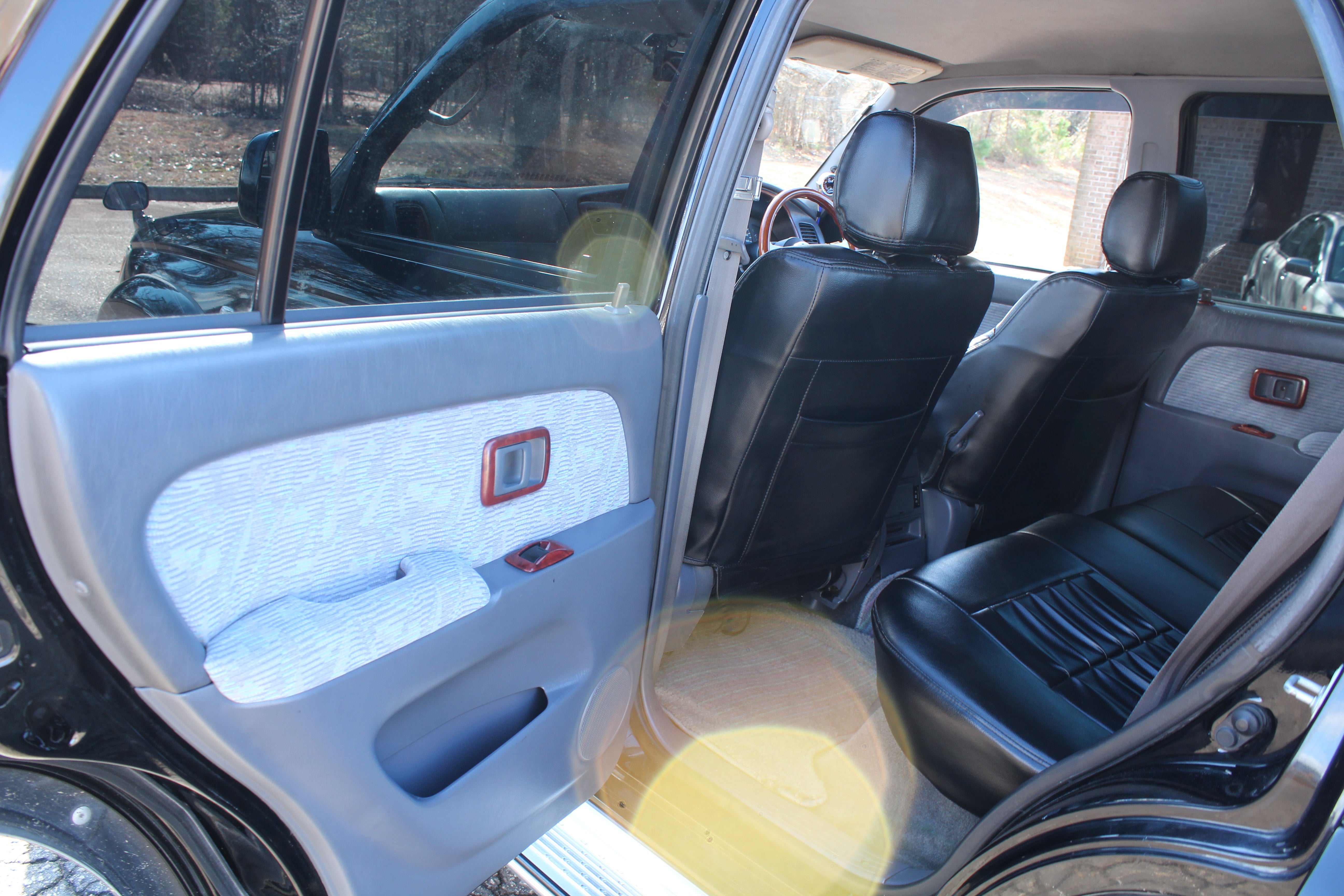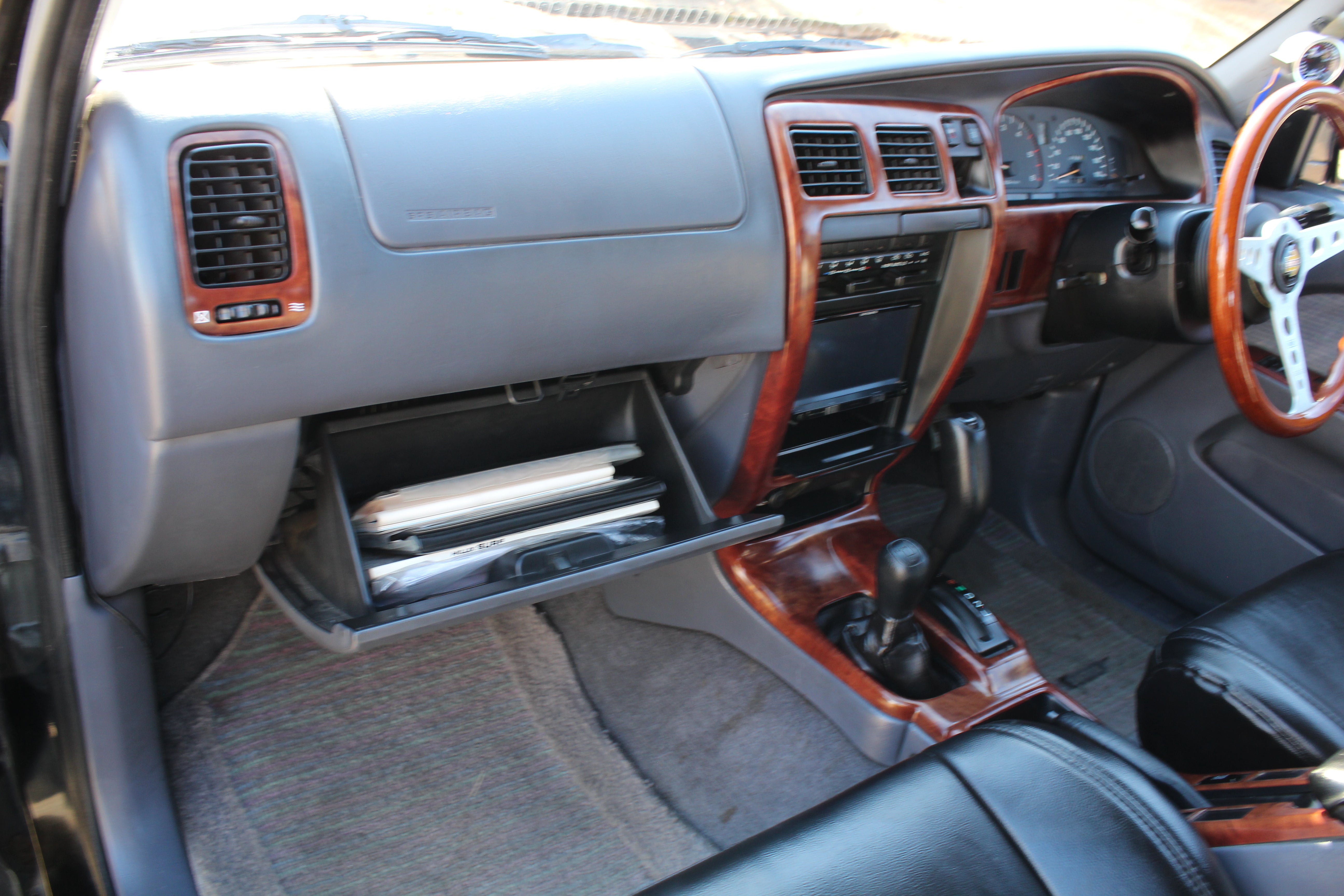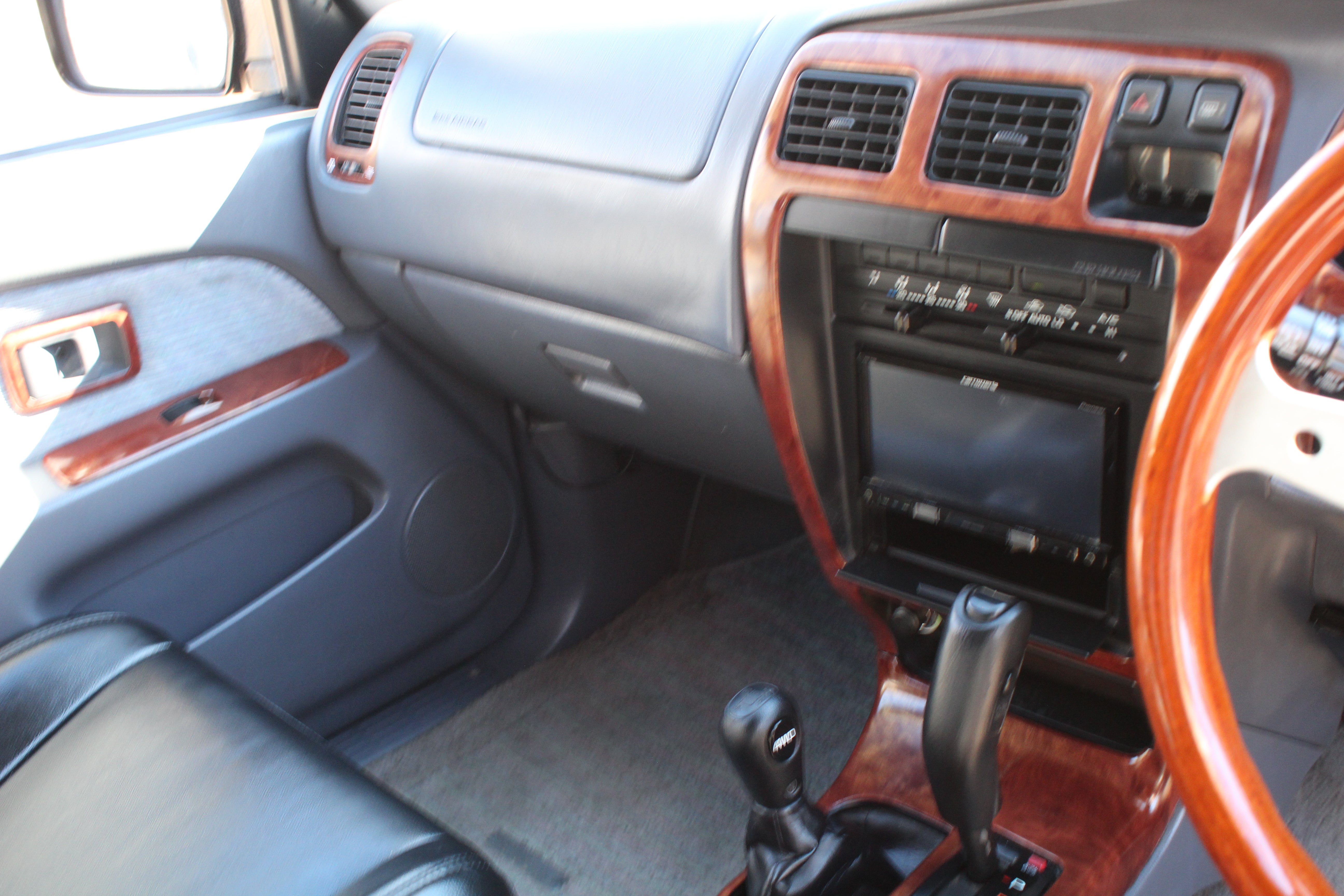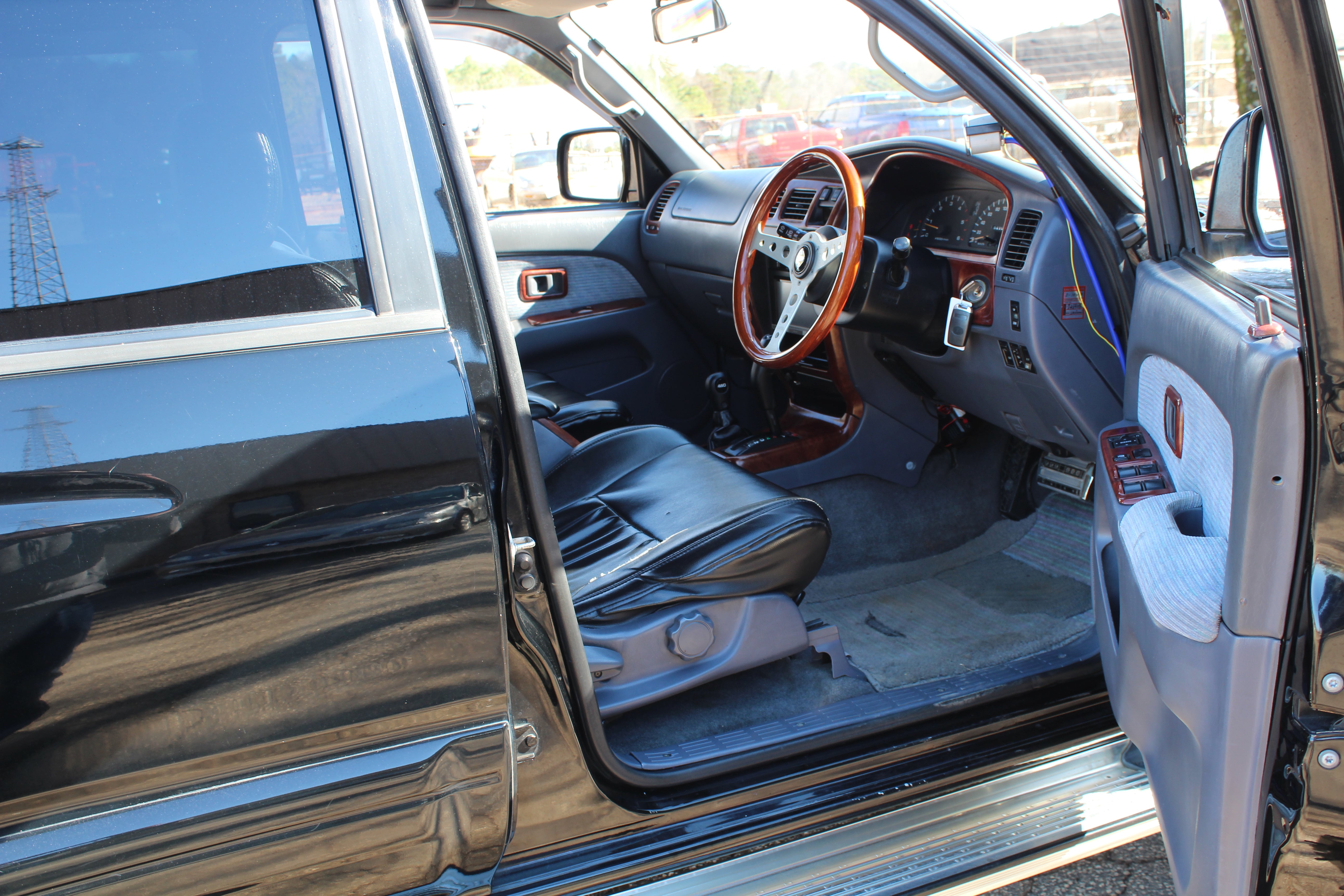 Has Pro Comp aftermarket 16" wheels with 265/75r16 bfgoodrich all terain tires. Has a lift kit, came like this from Japan, cold air intake, momo woodgrain steering wheel, seats have leather seat covers and original seats look good underneath, LED Headlights, Aftermarket led fog lights, Aftermarket Headunit, Has Hitch. Had a full service done 30k miles ago